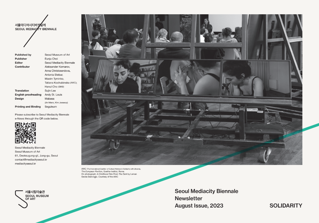 SOLIDARITY, the SMB Periodicals Newsletter August issue introduces an interview with AWC. The International Coalition of Cultural Workers in Solidarity with Ukraine) in order to study further on the ideas of 12th Seoul Mediacity Biennale (SMB12). The non-territorial mapping referenced throughout SMB12 unfolds imagined alternatives for crossing boundaries in an era when extremist nationalism and cultural isolationism have become particularly acute. As an art collective and platform that has actively implemented the language of interdependency throughout non-territorial solidarities within the limits of geopolitical crises and territorial maps in recent years, AWC strongly argues for the solidarity and diversity of art and cultural workers. This interview with AWC offers an opportunity to confirm the political role of the biennale, which acts as a truly global public space and an alternative to constant displacement and border crossing.