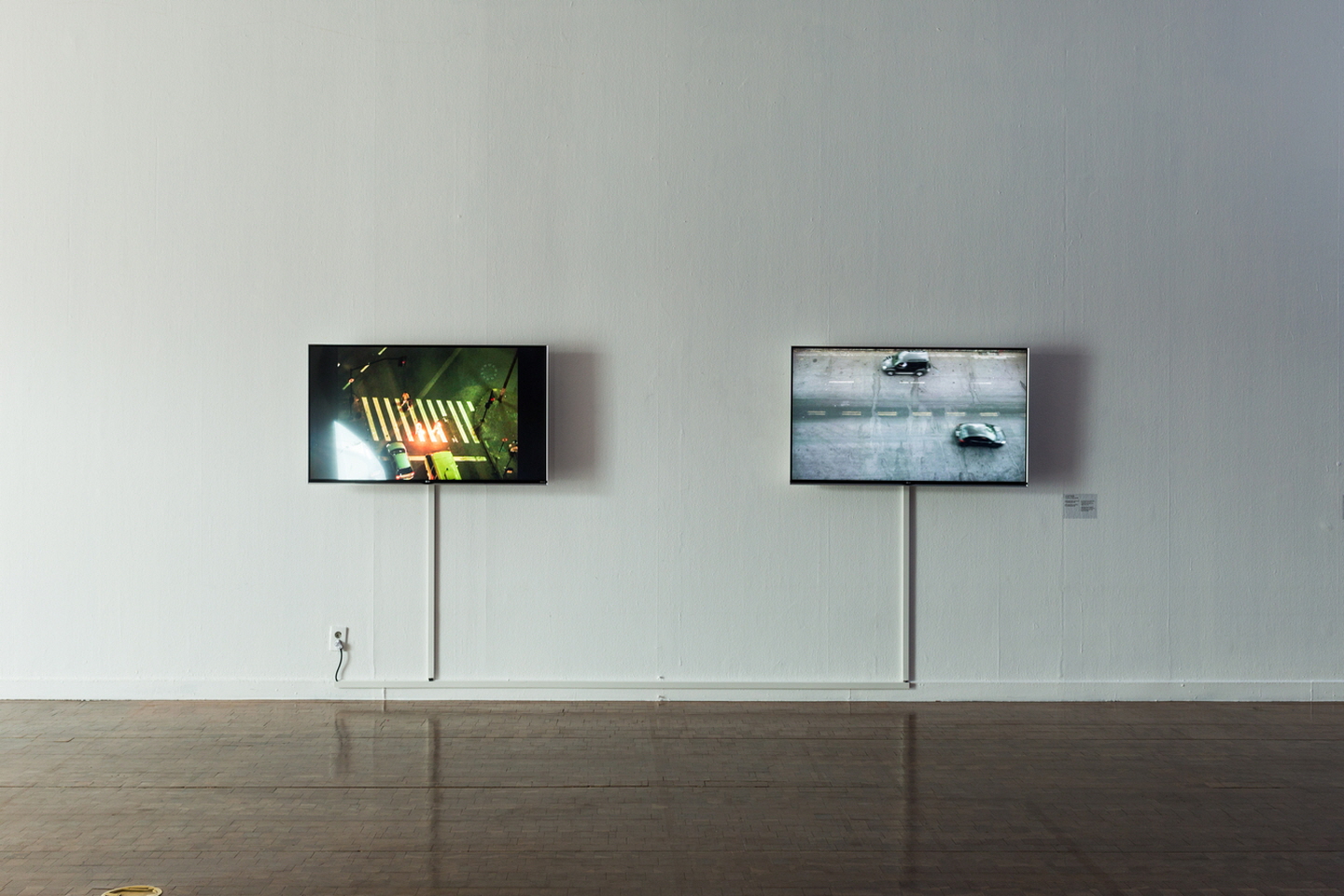 In Automóvel [Automobile], a camera captures cars speeding along a two-way street on an ordinary weekday in the middle of a city. An instant later, one side of the road becomes completely blocked and we begin to hear the sound of clamorous horns and cars broken down on the road are emitting smoke. Then we see an image of the drivers and their passengers getting out and slowly pushing their cars; the same situation arises on the opposite side of the road. In the end, all the cars on the road are being pushed by people as day gradually changes to night. Seeing the cars no longer able to run, and drivers forced to get out and push them makes us reconsider the speed of our lives to which we have become accustomed. In addition, the drivers who ultimately become trapped in the dark night as they push their cars forward remind us of the evil Corinthian king Sisyphus who was condemned to hell after his death where he was forced to eternally push a boulder up a steep mountain, and we are compelled to rethink the exact meaning of moving forward.