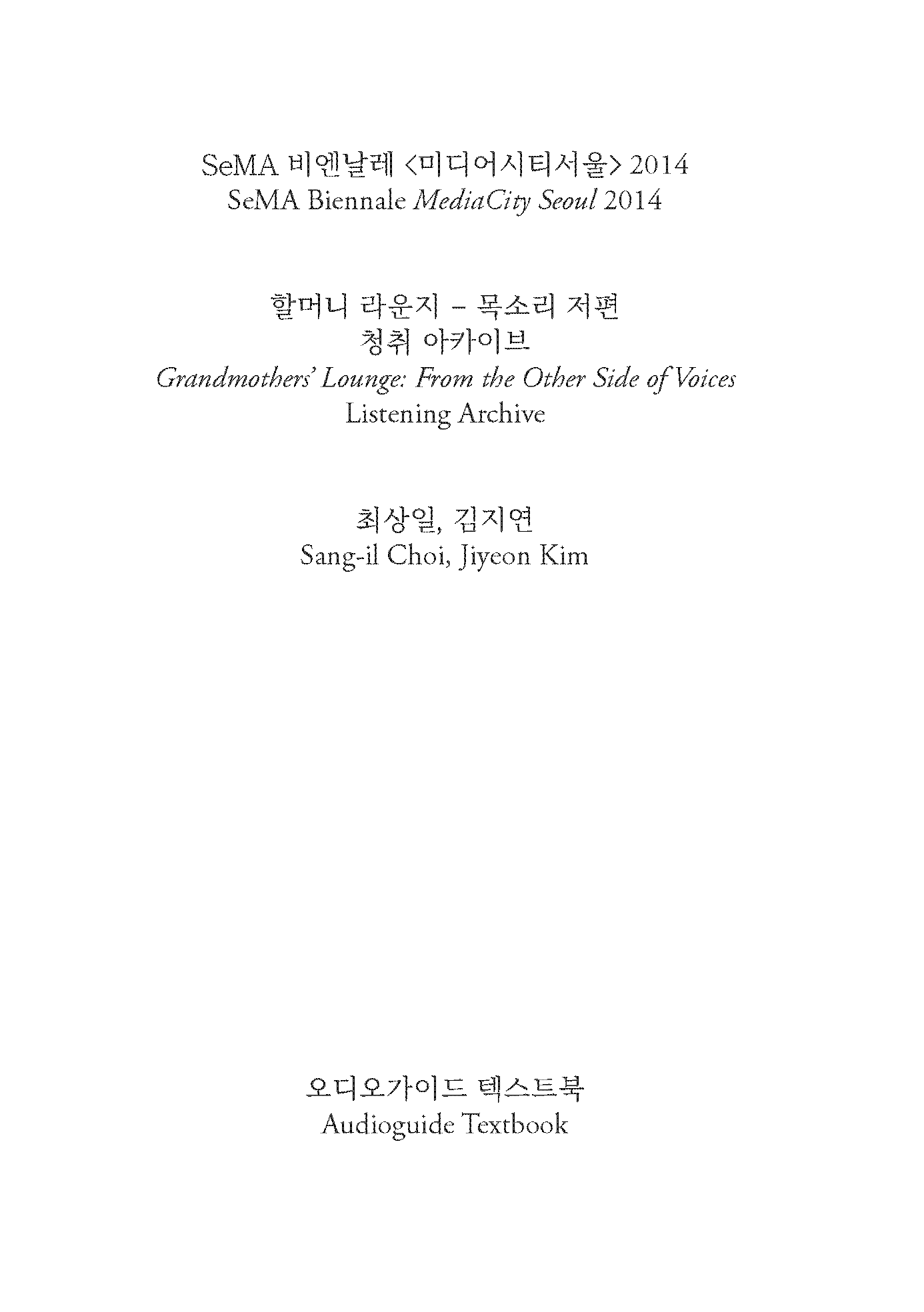〈할머니 라운지 - 목소리 저편〉 청취 아카이브 오디오가이드는 최상일 프로듀서가 제작한 광범위한 음성 자료에 접근하기 위한 안내서이다. 54개의 오디오 클립과 3개의 〈믹스 포 라운지〉는 아카이브 탐험자들에게 각각 ‘선별된 재생목록’과 ‘감상용 믹스트랙’으로 제시된다. 오디오가이드 텍스트북은 오디오가이드를 들을 때 읽는 보조물로, 청취자의 이해를 돕기 위해 할머니의 구술을 정리한 글을 중심으로 오디오가이드 자료 목록과 최상일, 김지연의 대화가 함께 실려 있다.