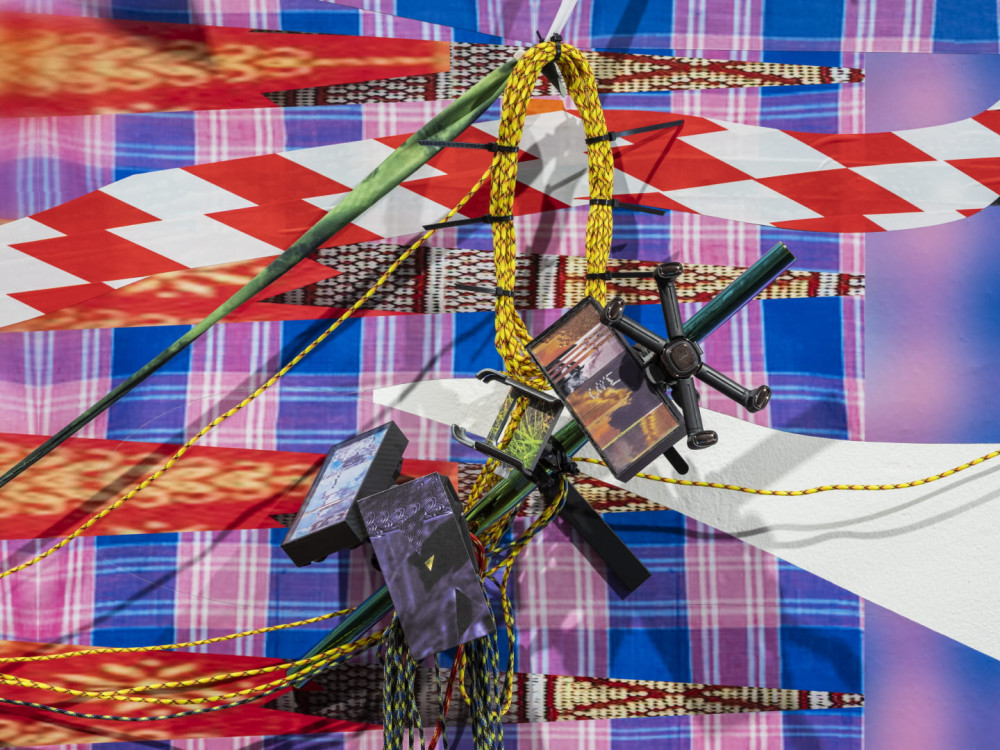 파이어룰 달마, 〈l❤️ndsc_₱€$s (poienxcinoti) featuring rawanxberdenyut, Aleezon, Lee Khee San, Lé Luhur from NUS Museum’s South and Southeast Asia Collection and Autaspace, CC1, Dahlia, Alawiyah and 风)〉, 2023. 합성 폴리머 페인트(골든) 위에 폴리메타크릴산 메틸(플렉시글라스 타이거), 에폭시 레진(사무라이 2K), 양극산화 알루미늄 합금 위에 카멜레온 탄소 섬유 폴리염화비닐과 폴리아크릴산 접착제(Vvivid XPO), 벌집무늬 역반사테이프(그립온), 폴리메타크릴산 메틸과 나무 위에 폴리염화비닐과 비금속 반사테이프(스티브 앤 리프), 폴리에스터 실로 직조한 다양한 재활용 직물, 폴리염화비닐 위에 자일렌. 413 × 1730 cm. 제12회 서울미디어시티비엔날레 커미션 및 싱가포르 예술위원회 제작 지원. 작가 제공. 제12회 서울미디어시티비엔날레 《이것 역시 지도》. 서울시립미술관. 2023. 사진: 글림워커스