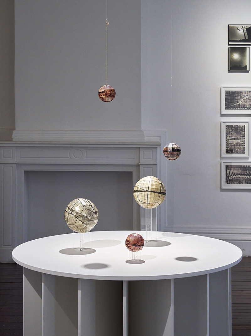 〈공간과 시지각1987-1〉과 〈공간과 시지각1987-2〉는 지구본처럼 둥근 형상을 가진 ‘사진-조각’이다. 1986년에 발표한 〈공간과 시지각〉에서 사용했던 정글짐 사진이 이 작품에서는 구형상의 전면을 감싼다. 작가는 사람의 둥근 눈에 맺히는 상은 원래 둥근데, 그동안 우리가 재현해 온 평면의 이미지에서 소실점에 모이는 직선의 납작한 공간으로 잘못 표현하였다고 주장했다. 그리고 사람 눈의 동공(홍채)을 중심으로 완벽하게 둥글게 보이는 공간과 유사하게 입체적인 재현을 시도했다. 작품의 표면은 정글짐이 서 있는 풍경과 그 풍경을 바라보는 작가의 그림자까지 담은 이미지를 재현하고 있다. 작품은 천장에 매달아서 감상하는 형태로 구성되는데, 줄을 연결하는 지점은 사진기를 든 작가가 서 있는 바로 그 지점이다. 사람의 눈이 대상을 보는 원리와 유사한 사진기의 중심점에서 완벽하게 둥글게 보이는 세상이 재현되어 있다.