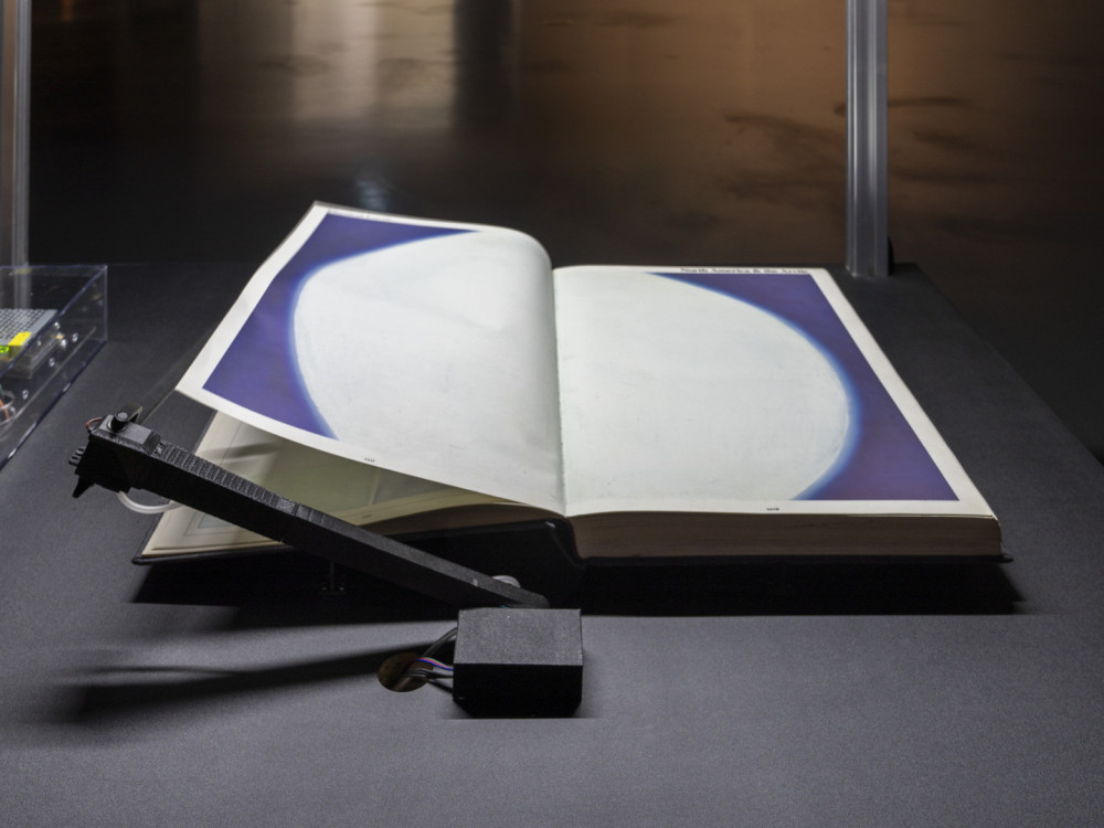 아구스티나 우드게이트, 〈신세계 지도〉, 2023. 주문제작 자동페이지 플리퍼, 스캐너, 주문제작 생성시스템. 가변 크기. AI 스크립트와 이미지 생성 시스템 개발: 브와제이 코토프스키. 3D 모델링과 로보틱스: 헤르만 페레즈, 이성은. 전기 디자인: 가브리엘라 문기아. 제12회 서울미디어시티비엔날레, 부에노스아이레스 바로 및 아담 미츠키에비츠 문화원 제작 지원. 작가 및 부에노스아이레스 바로 제공. 서울시립미술관 소장. 제12회 서울미디어시티비엔날레 《이것 역시 지도》. 서울시립미술관. 2023. 사진: 글림워커스