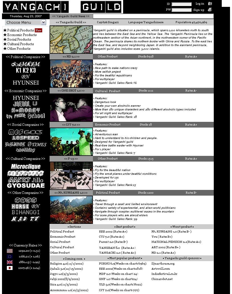 The web project Yangachi Guild, which thematized data, was created amid these circumstances. Data was obviously the most important subject for me, but Korea’s art scene paid more attention to Flash. I don’t know if you remember, but animation-focused contents such as Zolaman were such a hit that they almost became a cultural phenomenon, and Flash was the tool that most people used to create animations. I think the art world paid attention to the projects created with these tools because they were visualized rapidly. Unintentionally, I became the only person who spoke out about data. When everyone was doing Flash, the term “web art” began to surface as a way of characterizing the new phenomenon. That’s how the timing worked out.