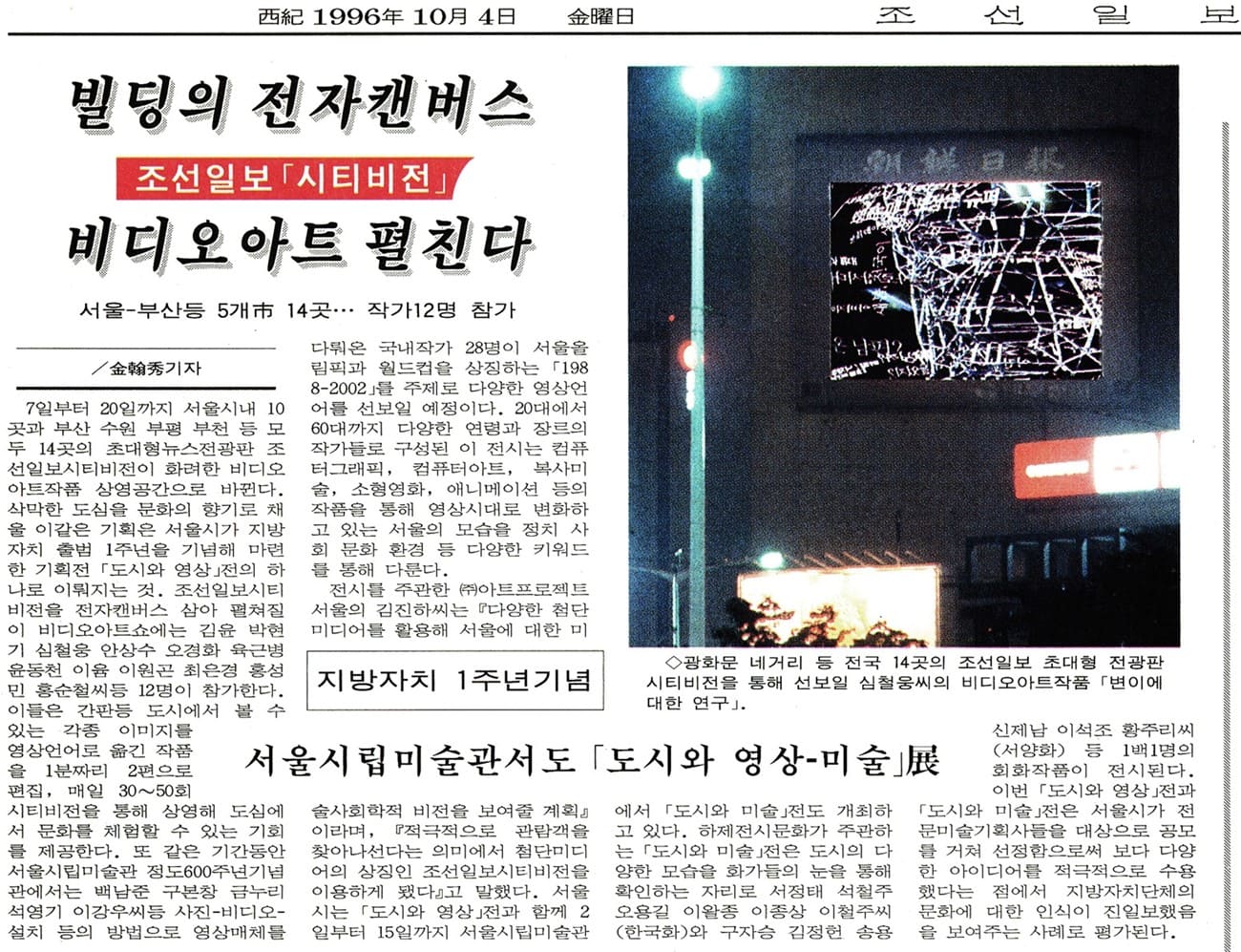 LEE At the time, Roh Hyung Suk, who is still working at The Hankyoreh today, had just started working as an art journalist, and he showed a particular interest in this project. One time, we went out to the Gwanghwamun intersection together to see the billboards on the buildings of the Dong-A Ilbo and Chosun Ilbo, and Roh was asking questions to random people on the street. However, most people didn’t really notice the videos-or, at least, they didn’t realize that the videos were different than the regular advertisements that appeared on the billboards. They just thought of them as new advertisements and didn’t see them as “artworks.”
