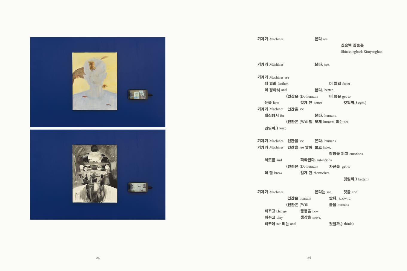 PARK The Eu Zên catalogue took a somewhat unique approach. Instead of focusing on the final results of the Biennale, the plan was to feature specific aspects of the artists’ working processes. Since each artist provided different kinds of texts and visual materials, we decided to orient the design according to the different characteristics of these diverse contributions rather than imposing a uniform approach. I enjoy working in the space between conveying information and creating disruptions or fissures through editing and typography, so it was an interesting project for me. Usually in design work, content is viewed as fixed information. If a designer were to completely deconstruct this fixed information, that might be attributed to an inability to fulfill their responsibilities. Notwithstanding, it is possible to delay the delivery of information or introduce some confusion, and what I’m interested in is creating structures wherein information is delayed through the arrangement of characters so that the same information can be read differently. I also have a strong interest in bilingual and multilingual typesetting so I experimented with various methods of incorporating both Korean and English in the Eu Zên catalogue.