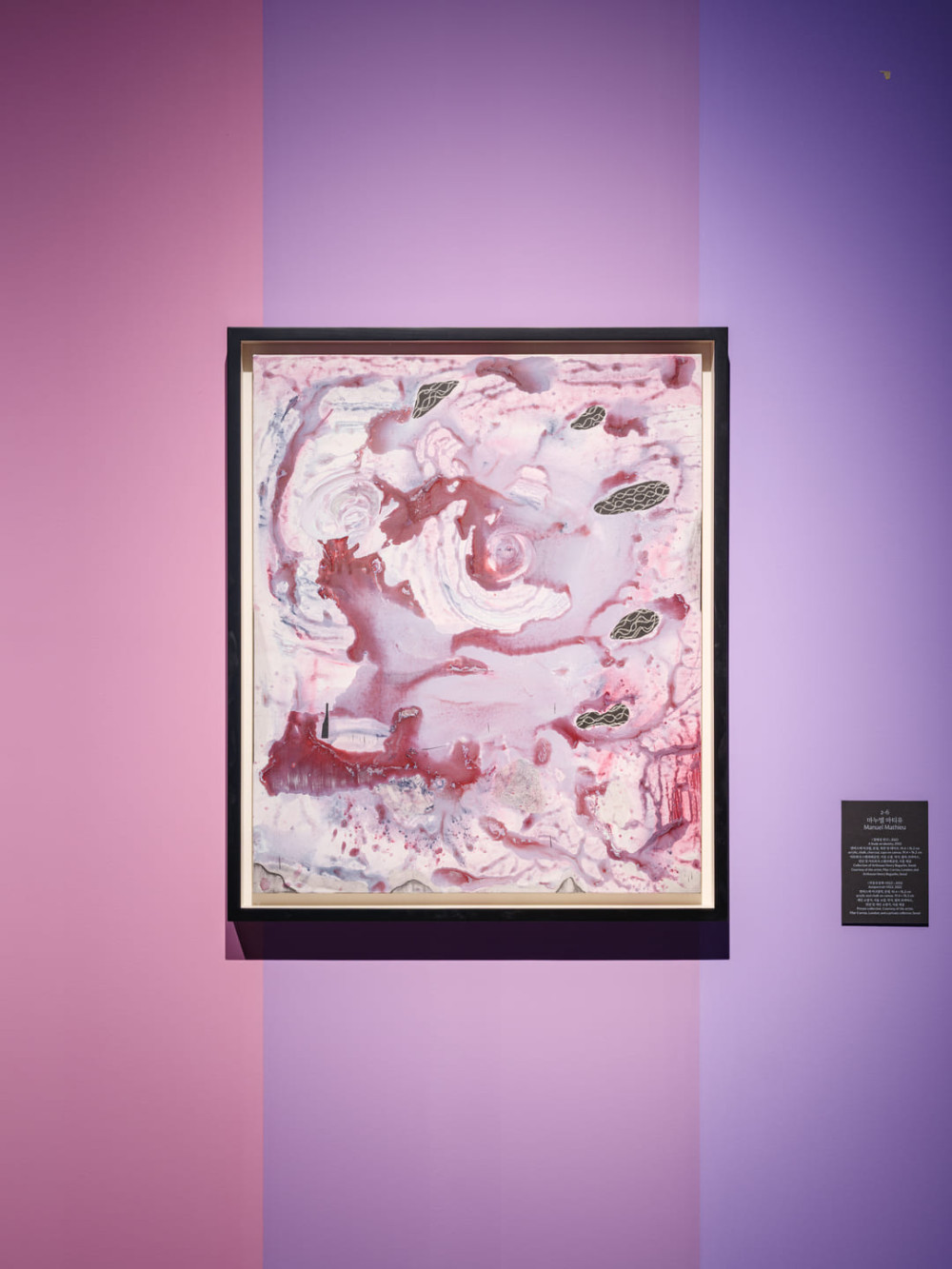 The fluid and intermingling forms of Manuel Mathieu’s paintings express multiple, hybrid, and unstable identities. The barely perceptible shapes emerging from these swirling pigments, stitched cutouts, and abrasive textures suggest that no person can ever perfectly be individuated from the historical and social conditions that shape them.