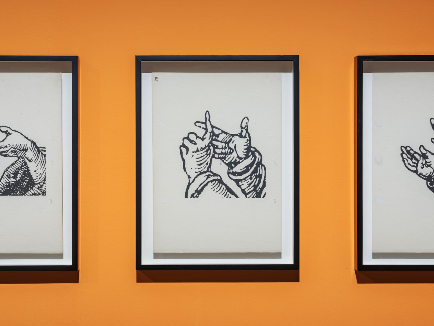 Inspired by Albrecht Dürer’s famous pen-and-ink drawing Praying Hands (1508), Magic Hands is a series of silkscreens reproducing images of the hands of saints drawn from other books printed by Dürer, paired with text from a book of magic tricks. Isolated from their original backgrounds, with the accoutrements of magical performance edited out, these hand gestures could be devotional actions or expressions of a secret language. Printed on antique and repurposed paper once used in the same museum in Vienna that houses Dürer’s masterpiece, these works also function as palimpsests of overlaid and obscured histories.