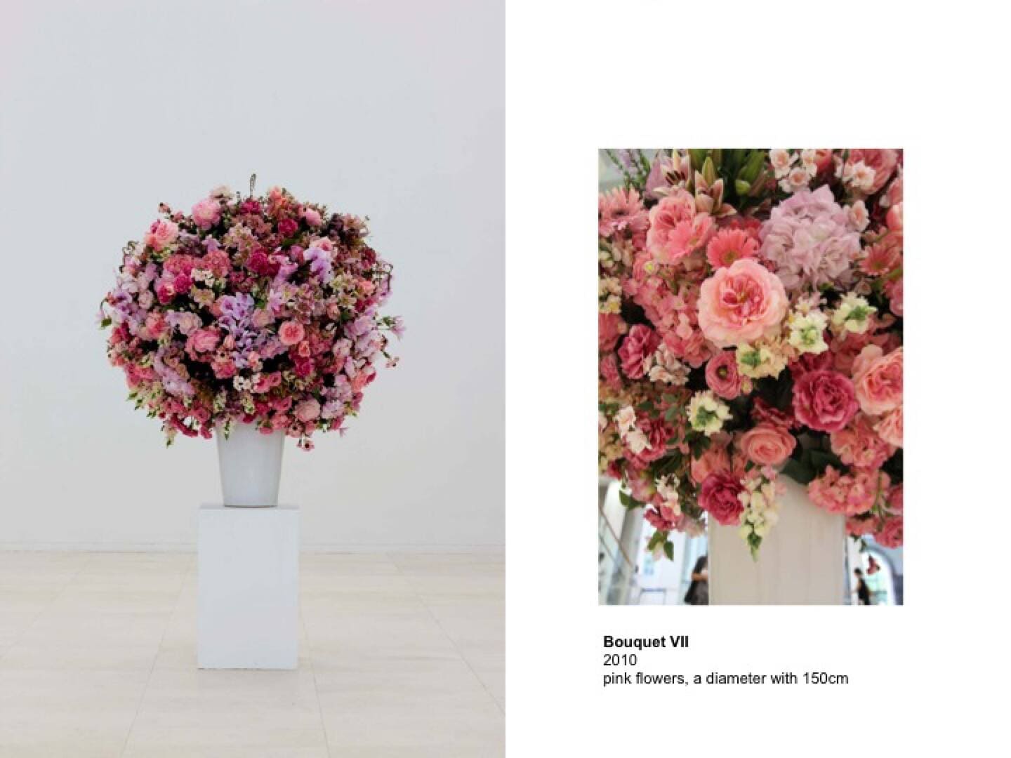 Bouquet VII is the seventh work in the Bouquet series, which began in 2003. It is being shown for the first time at Media City Seoul 2010. For the current work, the artist collaborated with Kim Da Ra, a florist, to create a bouquet of different types and sizes of pink flowers. The flowers in the bouquet, half real and half artificial, are each unique in color due to subtle differences in hue. In this work, the artist blurs of the boundary between the real and the artificial as the differences in each are gathered together and the division between truth and falsehood dissolves.