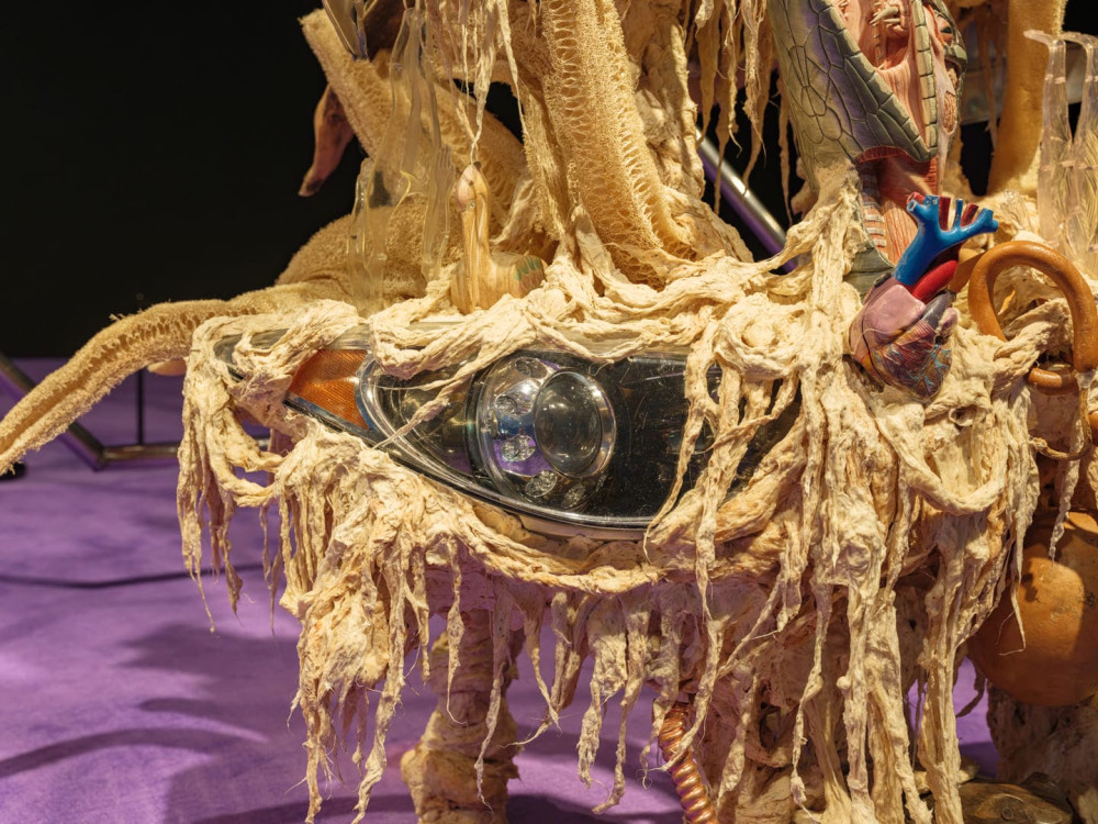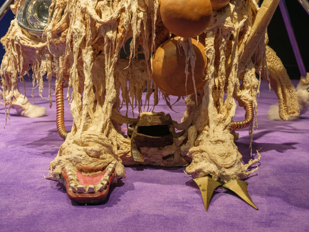Comprising materials as varied as loofahs, an anatomical model of a snake’s head and heart, obsidian, and six gongs, Disease Thrower #17 is designed to be activated by the artist during ceremonial rituals. These works incorporate objects, selected for their animistic properties, that Maravilla collected while retracing his childhood migration.