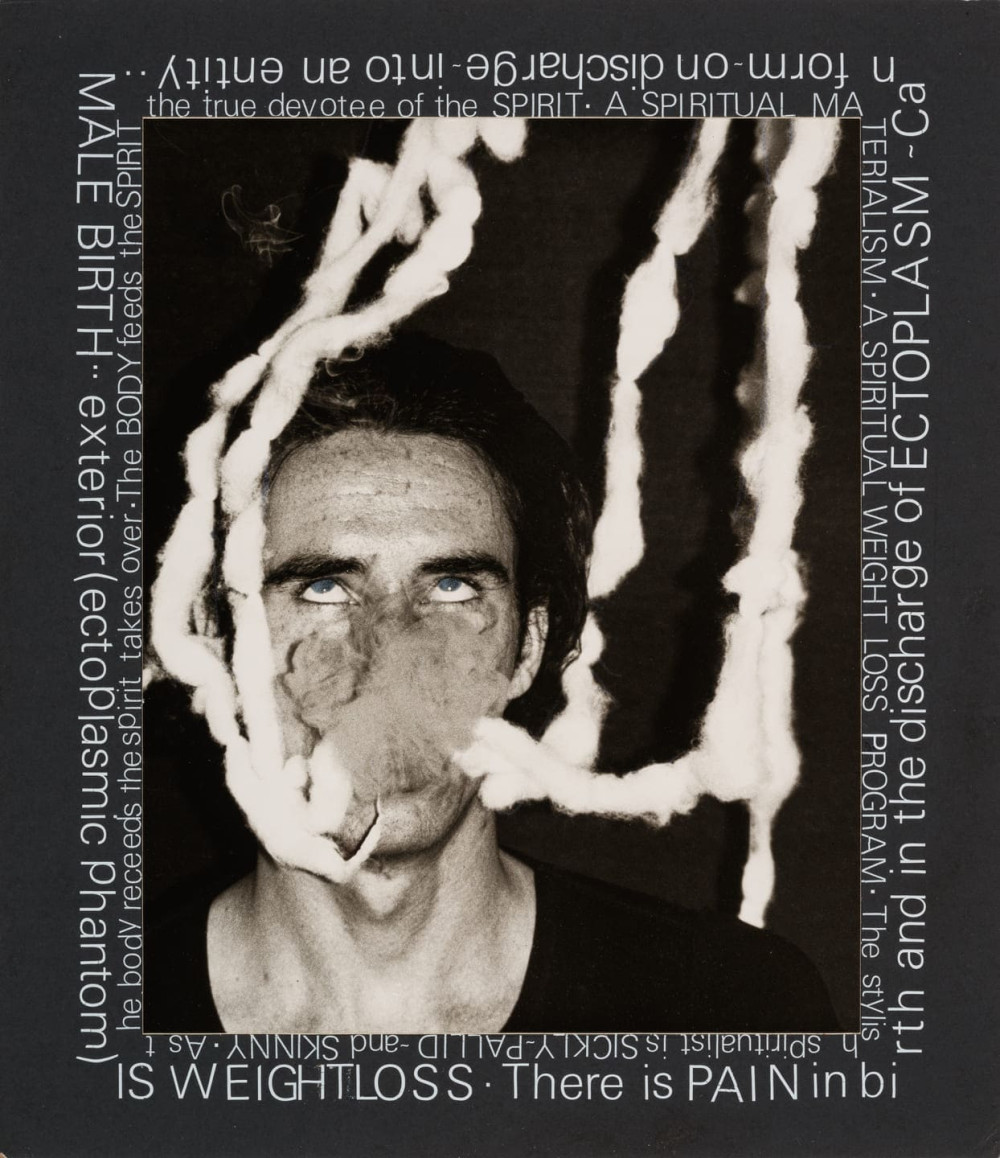“The Poltergeist” series pays ambivalent homage to the history of spiritualist photography, which gained popularity at the end of the nineteenth century for its claim to capture images of the dead on film. In these staged self-portraits, the artist is caught in the act of making contact with the spirit realm. The luminous substance streaming from the artist’s nose, mouth, and ears is ectoplasm, a paranormal material that emanates from the body of a medium in the performance of a séance. Only a skeptical materialist could mistake it for cotton wool.