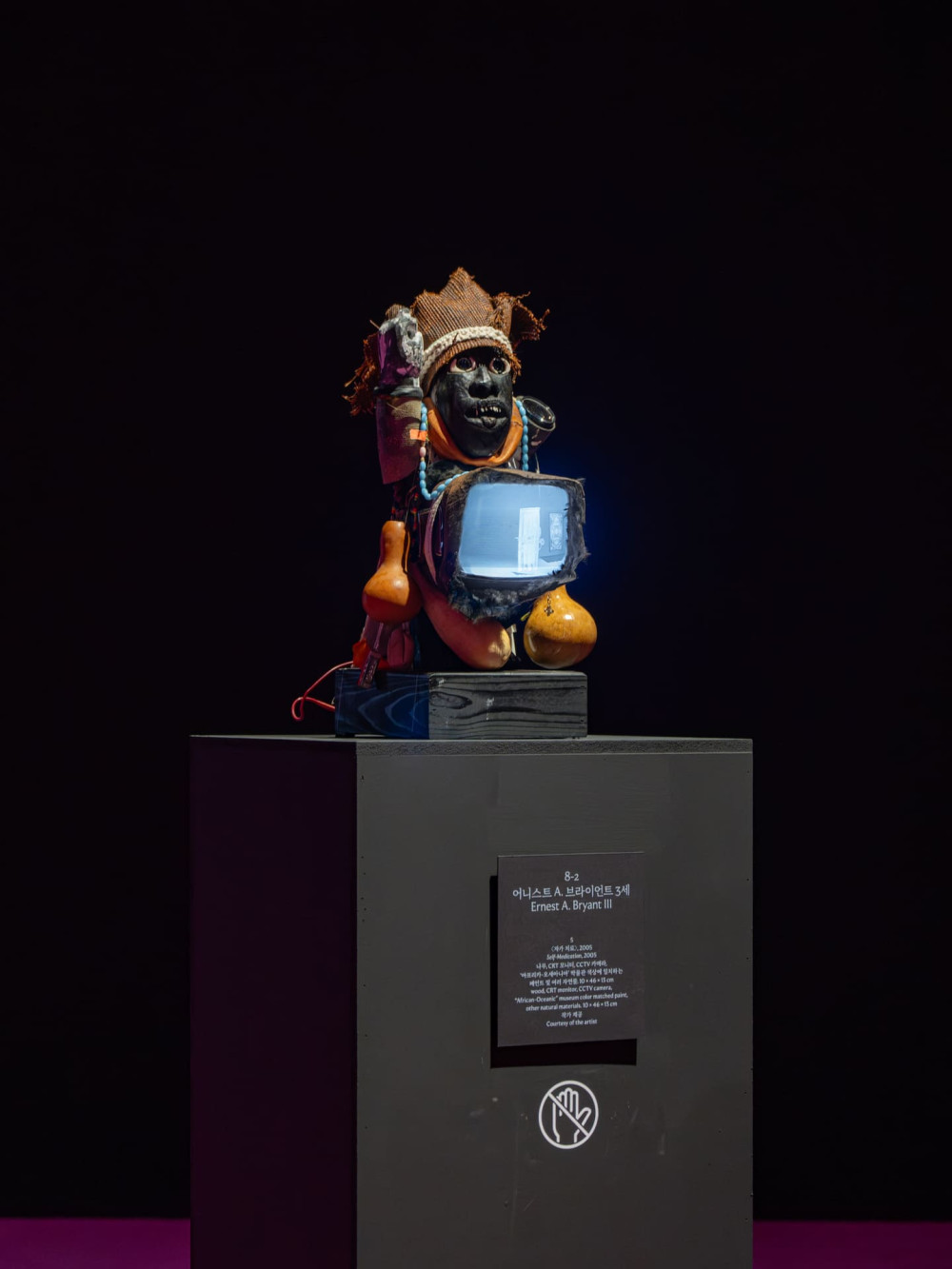 Ernest A. Bryant III, Self- Medication, 2005. wood, CRT monitor, CCTV camera, “African-Oceanic” museum color matched paint, other natural materials. 10 × 46 × 13 cm