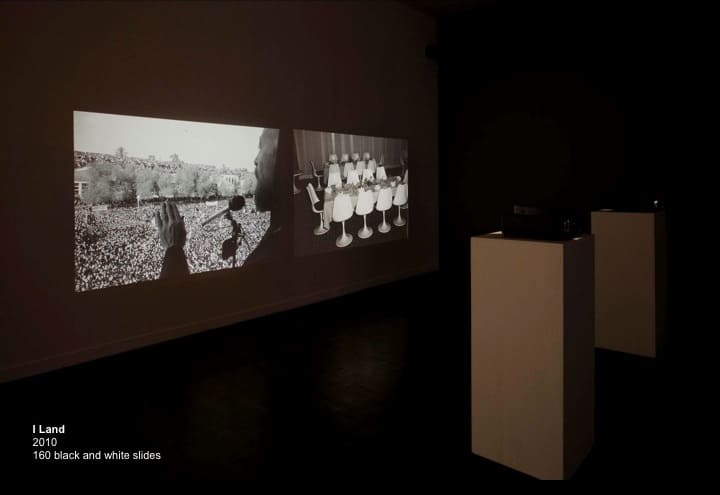 Unlike other artists from war-torn regions who tend to translate the horror and cruelty of war into direct source material for their work, Panayiotou, originally from the politically unstable nation and Cyprus, depicts his country’s political/social/cultural context in a gentle and calm manner, using official public records of reports as a medium. Utilizing archived images of Cyprus, the works Never Land, Wonder Land, and I Land depict the shape of the modern history of Cyprus. I Land is composed of 160 black-and-white slides based on photographs archived by Cyprus’s Bureau of Public Information. These pictures document the activities of Cyprus’s first president, Archbishop Makarios III, who held office from 1960 to 1977, and his ministers. Panayiotou is not only interested in the aesthetic value of the time captured in the archived images, but he is also interested in the values acquired through the process of accumulating the records. This leads him to inquire into what kind of perspectives and interpretations could be contained in the archived images which reveal the history and identity of a nation.