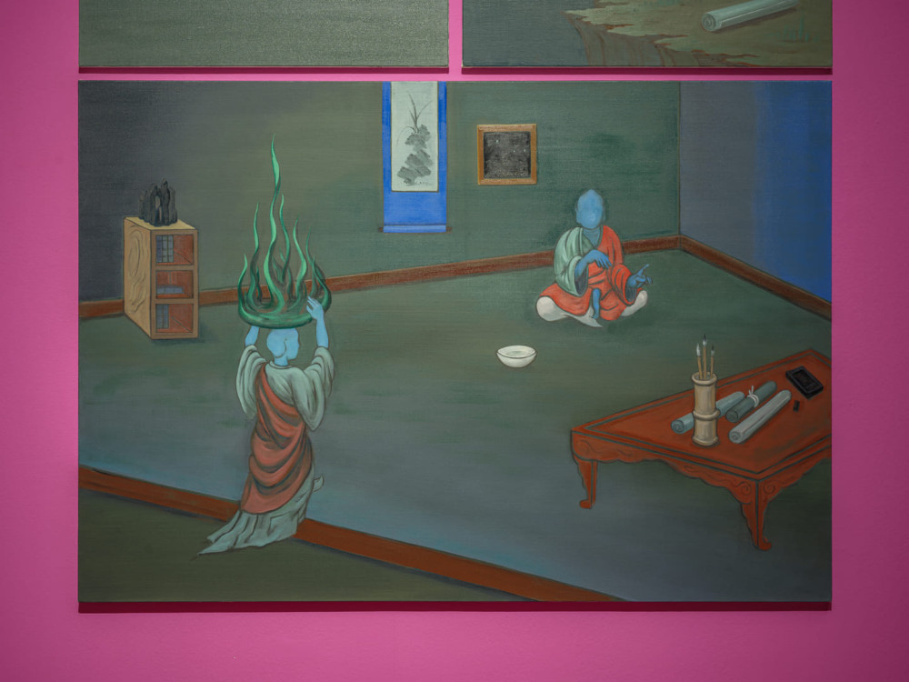 This new series of paintings presents a tale from the thirteenth-century Samguk Yusa (Stories of the Three Kingdoms of Ancient Korea). Having travelled to China during the Tang Dynasty to study with Wuwei Sanzang, only for the great master to refuse to teach him, Monk Hyetong expressed his determination to learn Buddhism by carrying a flaming brazier on his head. This story is still often depicted on the exterior walls of Buddhist temples in Korea.