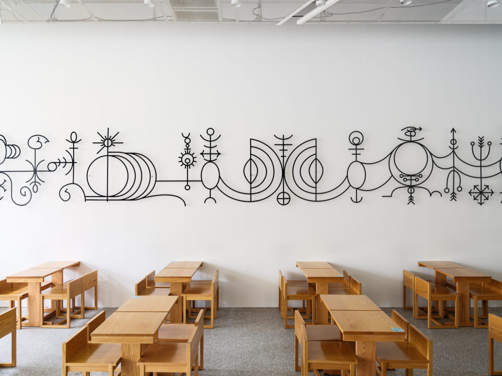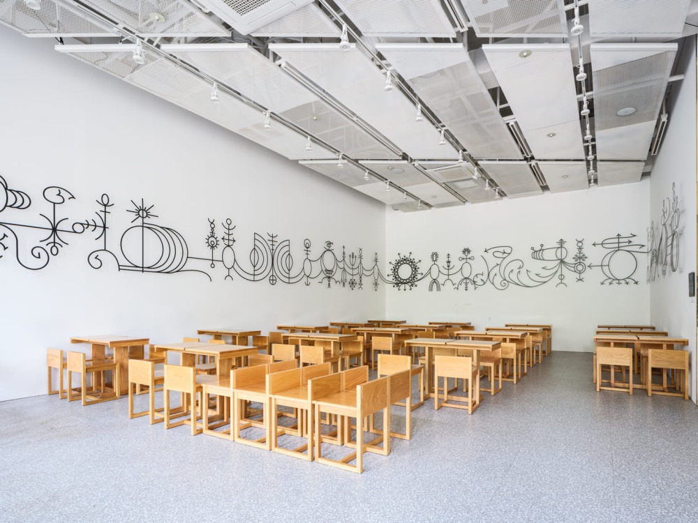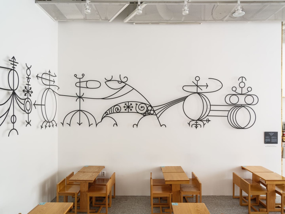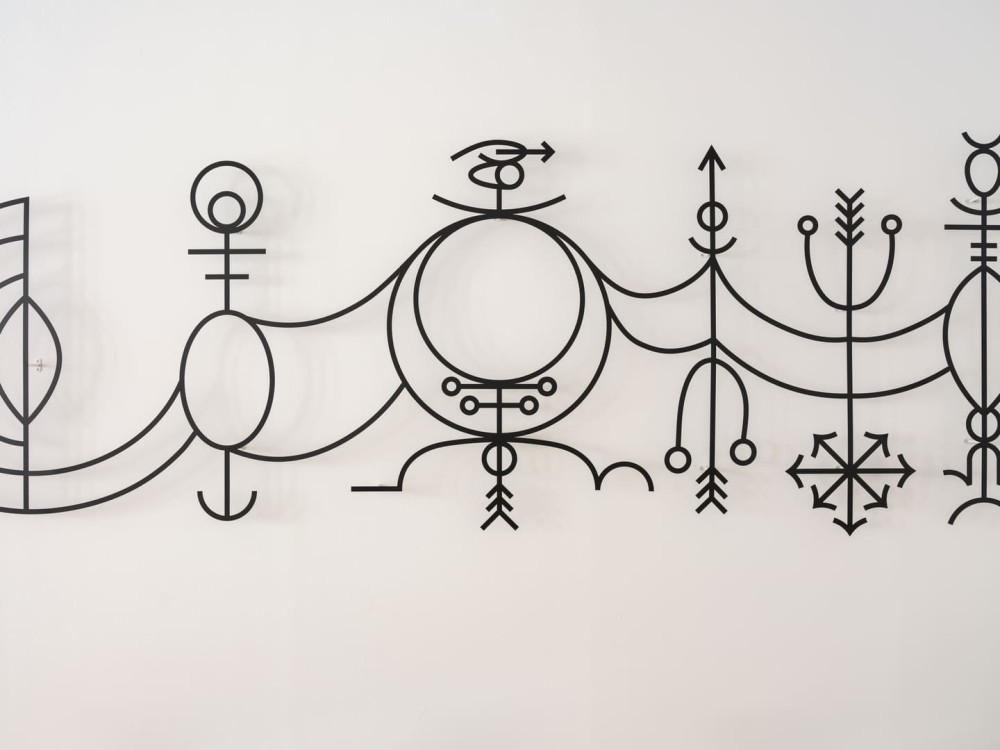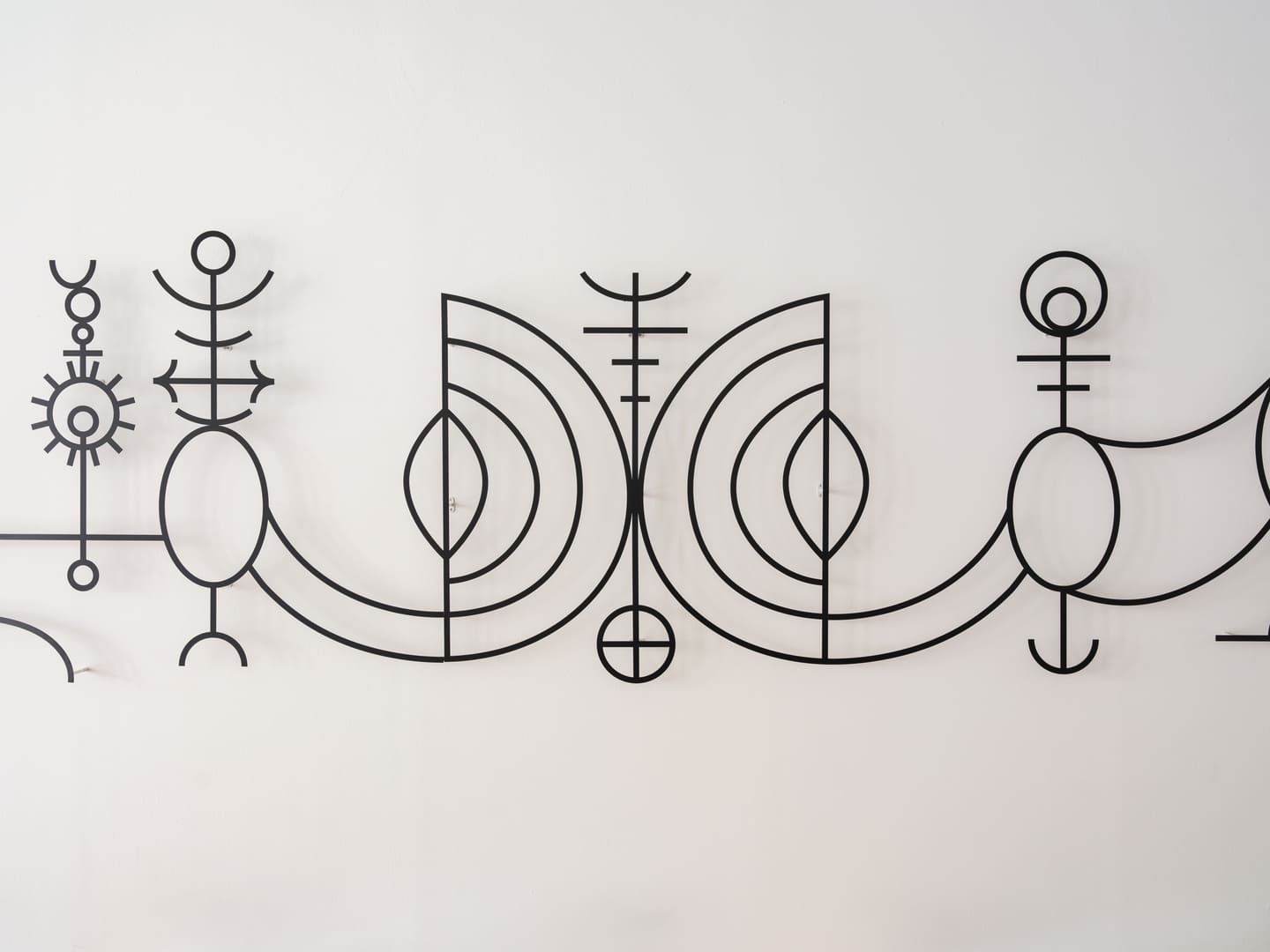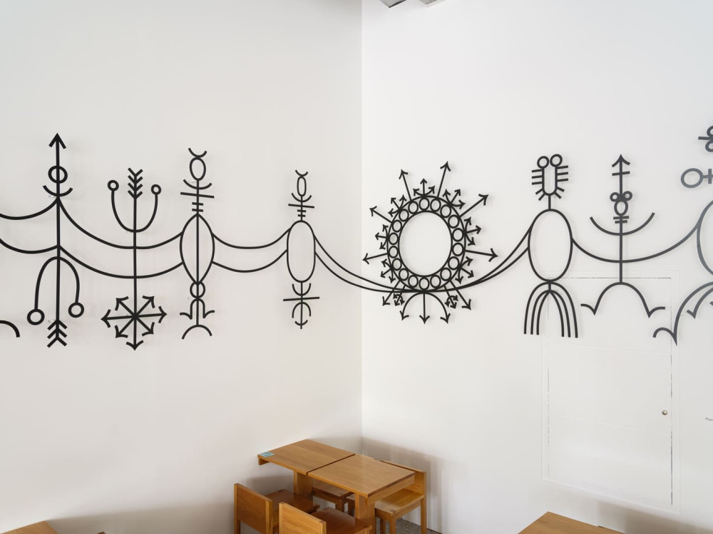 Even considering the shift in official attitudes towards Africa that followed the conclusion of the “five gray years” and Cuba’s intervention in the Angolan Civil War, it is surprising that Queneditt Morales should have been awarded the commission for a mural at the National Theater, a flagship of the government’s cultural project that opened in 1979. It is doubly surprising given that Queneditt Morales’s design for the café pays explicit homage to Abakuá, a secret religious society founded by freeborn Africans which had historically been suppressed by the Communist authorities. The mural was dismantled in the 1990s; this reconstruction is based on the handful of photographs to survive of a work that transplanted the symbols of Afro-Cuban spirituality into the heart of a secular official culture.