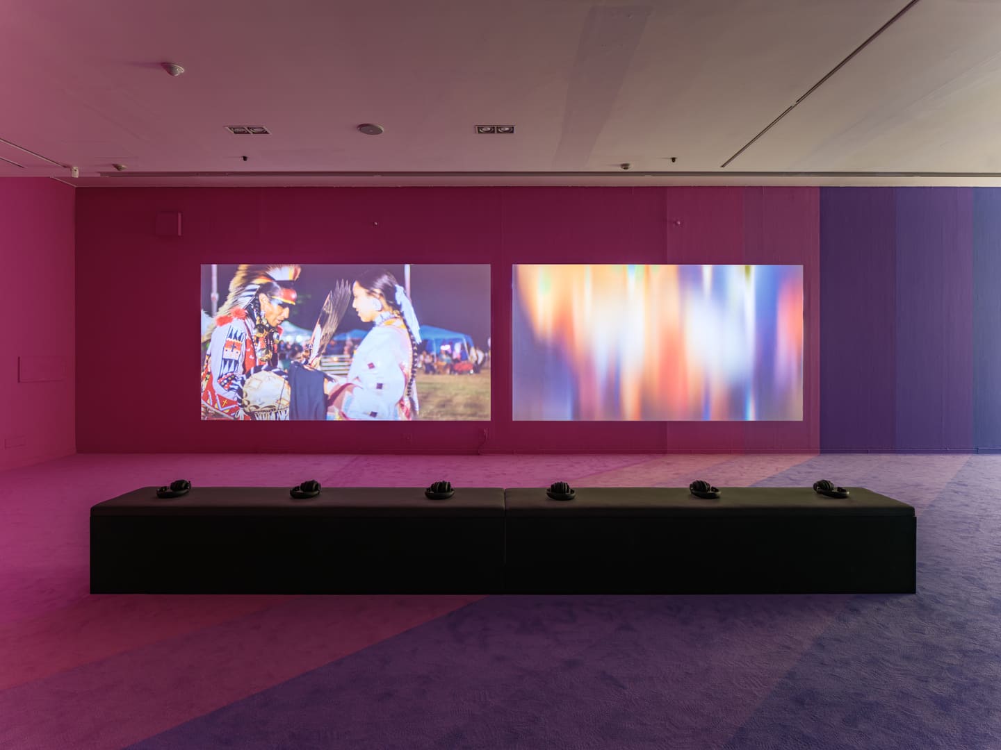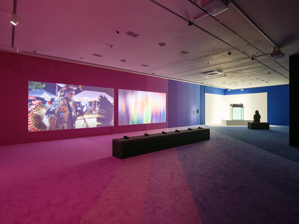 In this two-channel video, verses from a poem written by the artist are presented alongside scenes from a powwow. Emcee Ruben Little Head deftly guides the event’s audience—and the viewer—through the performance of a series of Northern Traditional dances. Footage in the video’s second channel is abstracted by one of Hopinka’s signature treatments, a formalist technique that forces the viewer to reflect upon their own position as observers of these rituals. The poem is superimposed onto this transformed image.