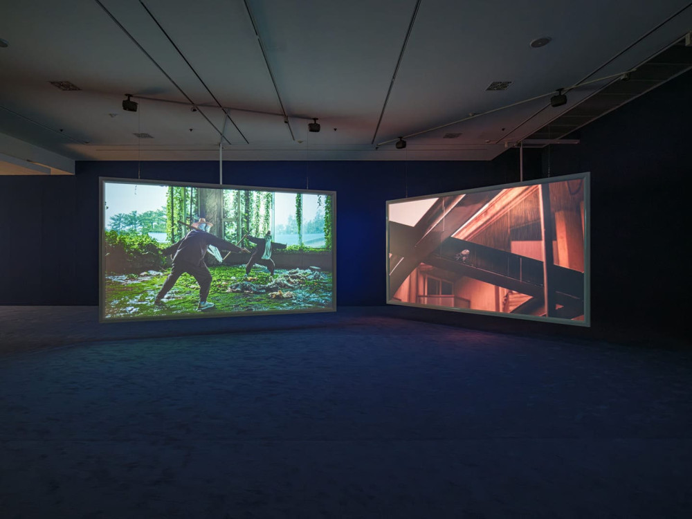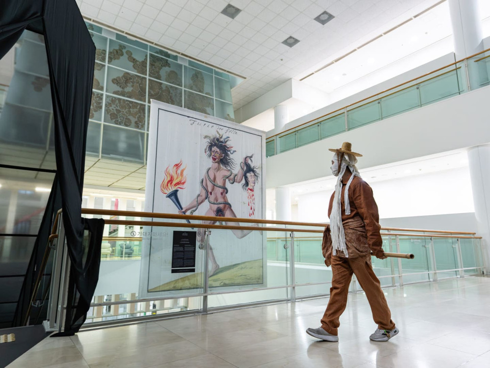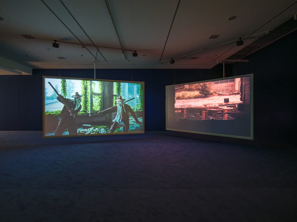 Jane Jin Kaisen, Sorrow Waters this Land, 2024. single-channel film (4K, color, stereo sound). 11 min 11 sec. Concept & Editing: Jane Jin Kaisen. Cinematography: Guston Sondin-Kung, Daniel Zox. Line Producer: Soyoung Kwon. Dokkaebi: Holly Yu, Jeijin Kim. Dokkaebi masks: Seo Sunshil. Assistant Director: Grace Sungeun Kim. Music: Lior Suliman. Colorist: Edoardo Rebecchi. Sound Engineer: Yoram Vazan. With support from: The Danish Artistic Research Funding Programme, Ministry of Culture