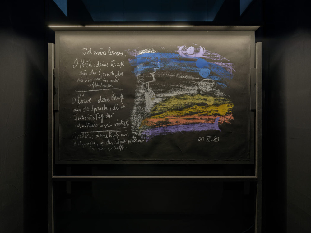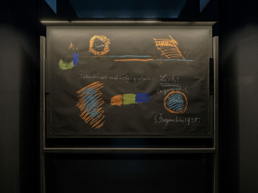 To communicate the principles of Anthroposophy, Steiner delivered thousands of unscripted public lectures, during which he would use a blackboard as a tool for thinking, directing his audience’s attention, or visualizing a connection. Over the course of the lecture, these diagrammatic sketches would be worked up into a picture that is also a document of the intellectual process: an action painting of the mind. At the conclusion of the lecture, these drawings in colored chalk on black paper were lifted from the board, fixed, and dated.