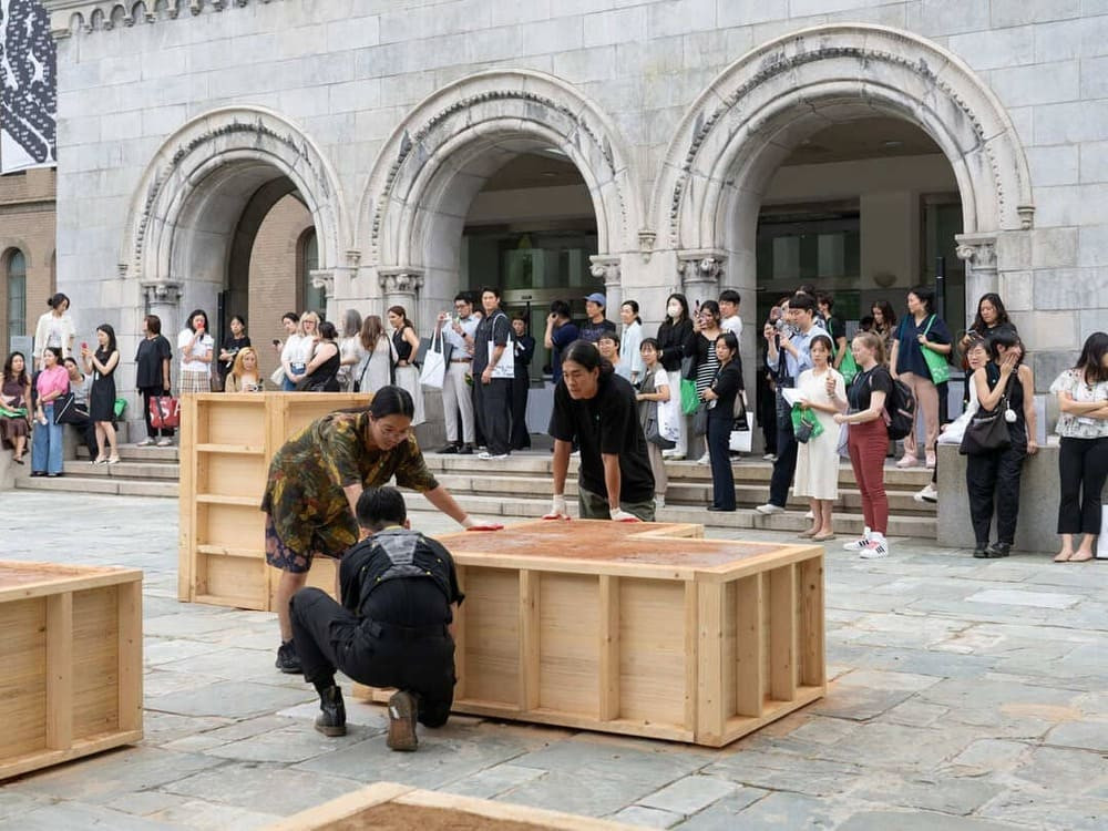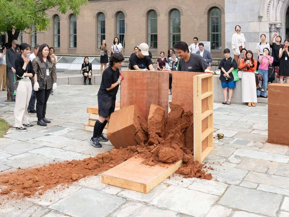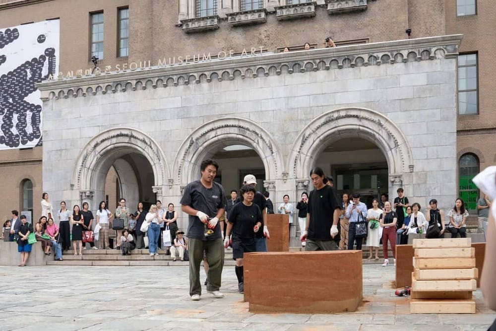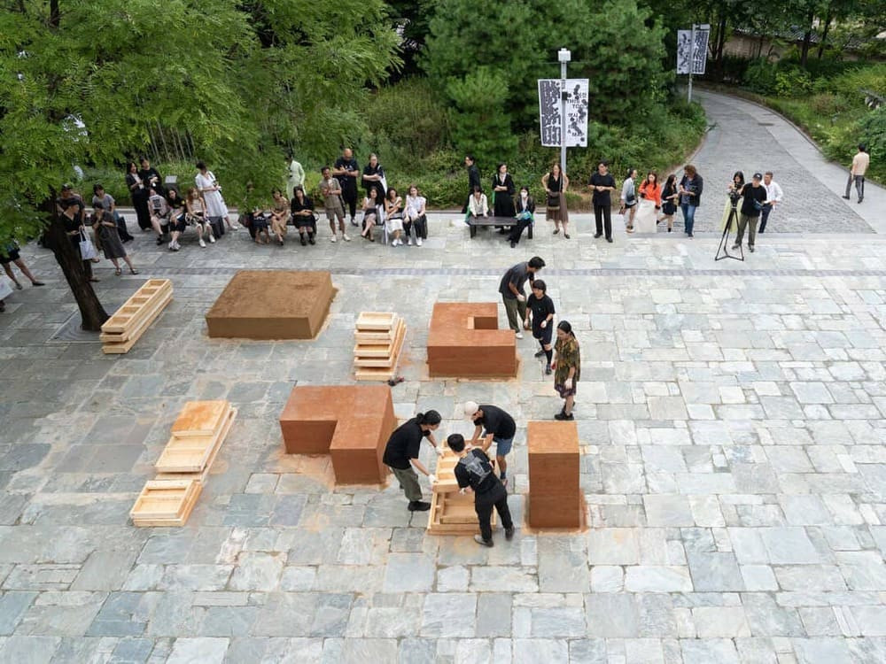 A new iteration of Earth Monument commissioned for SMB12 brings together ikkibawiKrrr’s past and present investigations. Three groups of soil monoliths stand in the museum’s courtyard, evoking a small town or newly developed city, composed of a mixture of soil, debris, and trash collected from the outskirts of Seoul’s satellite cities. Formerly home to industrial complexes, these cities were also home to the migrant communities that used to work in the factories, which are now being replaced by apartment blocks. As redevelopment has led to the displacement of migrant workers and dissolution of their communities, large plots of trees—some of which are a hundred years old—have also been uprooted, cut down, or displaced. The transfer of soil that used to connect communities and trees alike to the city center speaks to the movement of human and nonhuman individuals and communities across the country, as well as corresponding realities of migration and the bureaucratic boundaries of life.