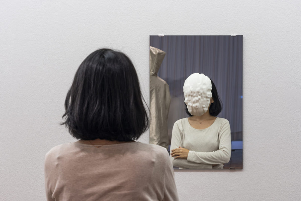스털링 크리스핀, 〈데이터 마스크(시리즈)〉, 2013–2015. 3D 프린트 나일론, 거울, 안면 인식 및 탐지 알고리듬, 유전 알고리듬. 18 × 26 cm. 작가 제공. 제10회 서울미디어시티비엔날레 《좋은 삶》. 서울시립미술관. 2018. 사진: 스튜디오 수직수평(유용지+홍철기)