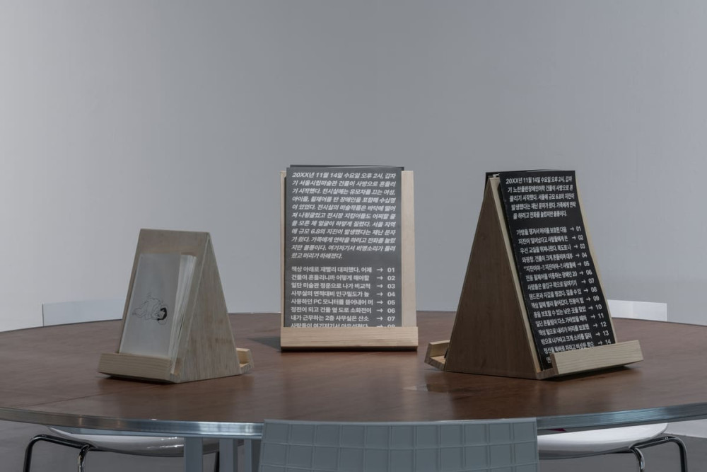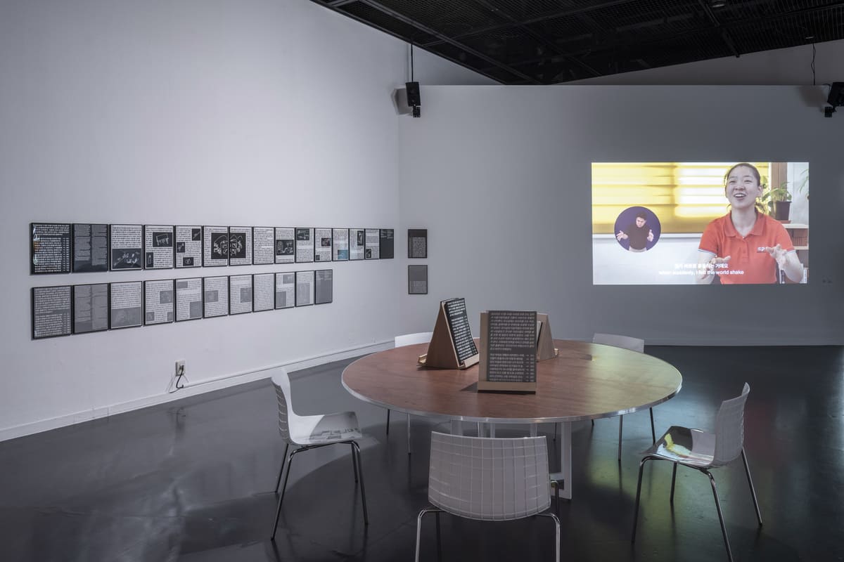 (1) 리슨투더시티, 〈누구도 남겨두지 않는다〉, 2018. 단채널 비디오(HD, 컬러, 한글, 영어, 수어). 30분. 제작: 리슨투더시티. 촬영 및 편집: 김청승(서울영상집단). 출연: 김성열, 김효정, 박두환, 이성우, 양인우, 하용준