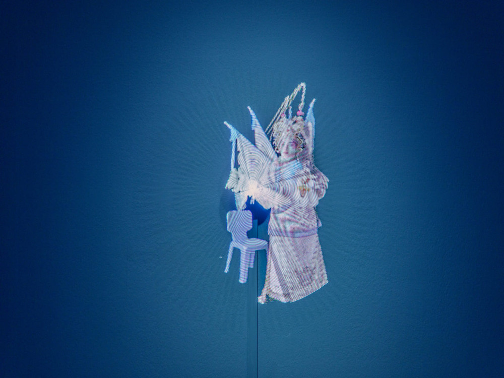 〈이미지의 광학〉은 〈오페라 그린〉의 편집 장면을 재구성해 이미지가 LED 디스플레이 위에 부유하는 것처럼 보이는 홀로그램 효과를 연출합니다. 영상의 편집 과정에서 삭제된 장면들은 즉흥적으로 포착된 파편처럼 유령 같은 형상으로 나타나며, 관객은 영상에서 특정 요소가 기술을 통해 생략되거나 인식되는 과정을 인지하며, 정체성과 서사가 형성되는 방식을 되짚게 됩니다.