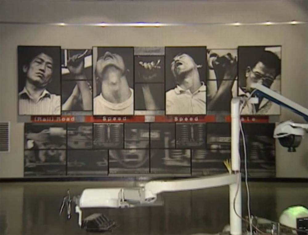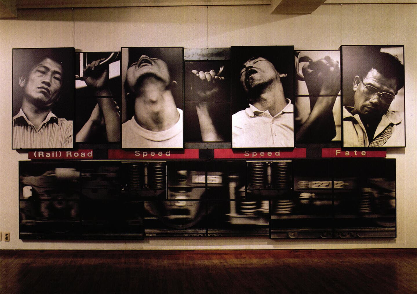 이강우, 〈길-속도-운명〉, 1996. 젤라틴 실버 프린트, 철, 컬러 스프레이, 텍스트. 244 × 504 cm. 작가 제공. 국립현대미술관 소장. 제1회 도시와 영상 《1988-2002》. 서울시립미술관. 1996