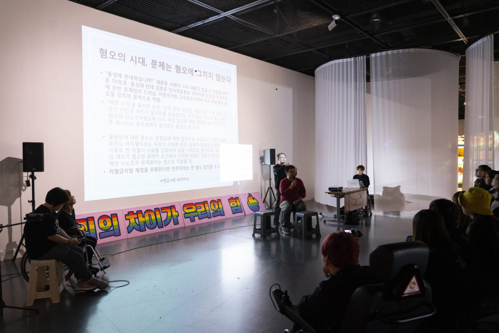 제10회 서울미디어시티비엔날레 《좋은 삶》 퍼포먼스 〈마침, 좋은 삶〉. 작가: 장애여성공감 극단 〈춤추는 허리〉. 서울시립미술관. 2018. 10. 03 - 10. 05. 사진: 스튜디오 수직수평(유용지+홍철기)