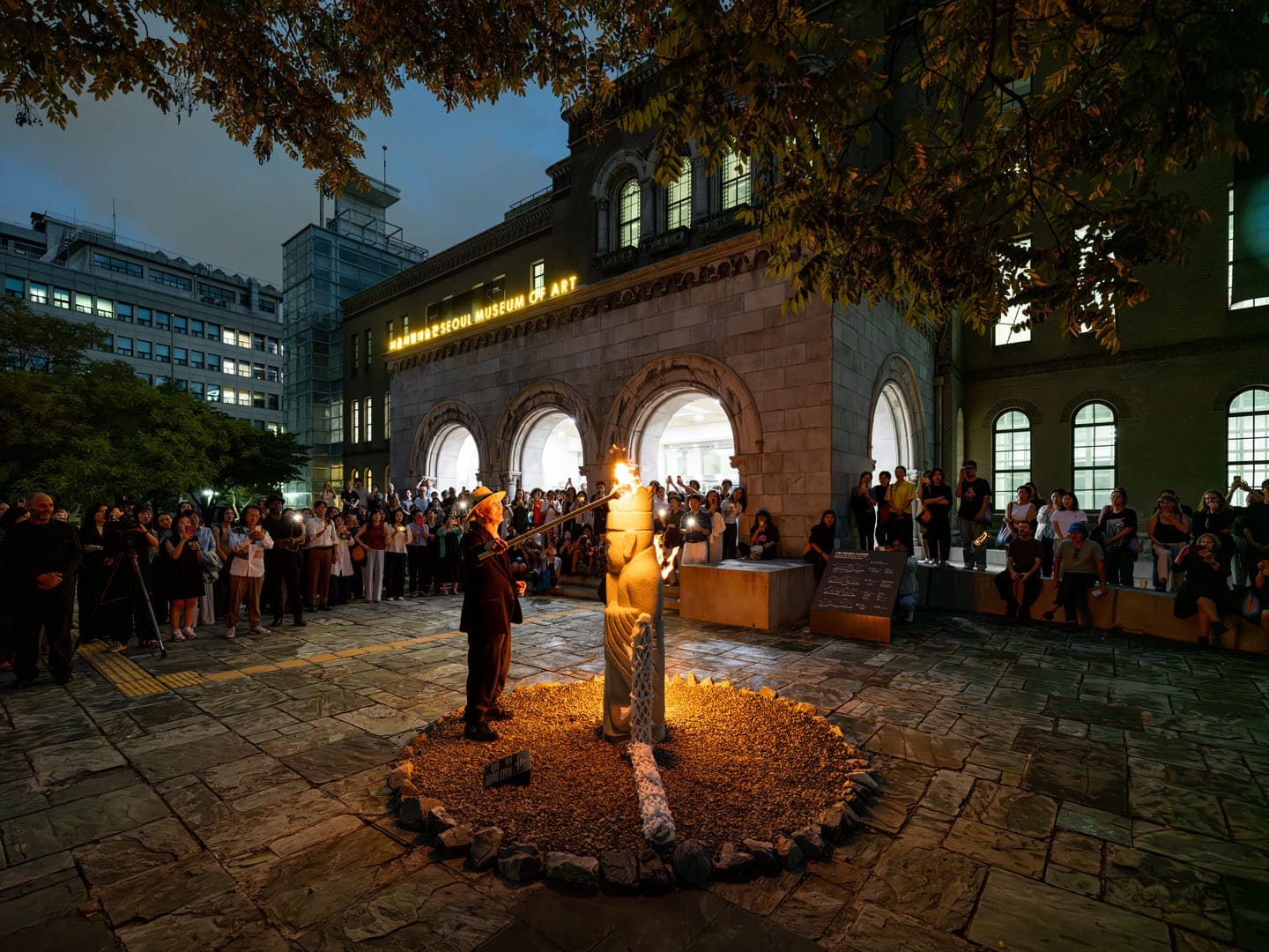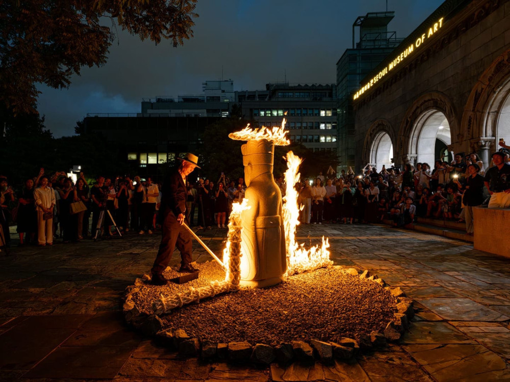 대지미술과 한국 무속 전통의 결합을 보여주는 이승택의 작업은 불, 물, 바람, 연기 등 자연 요소들과 나뭇가지, 한지, 돌, 밧줄, 철사 등 상징적인 오브제들을 폭넓게 결합합니다.