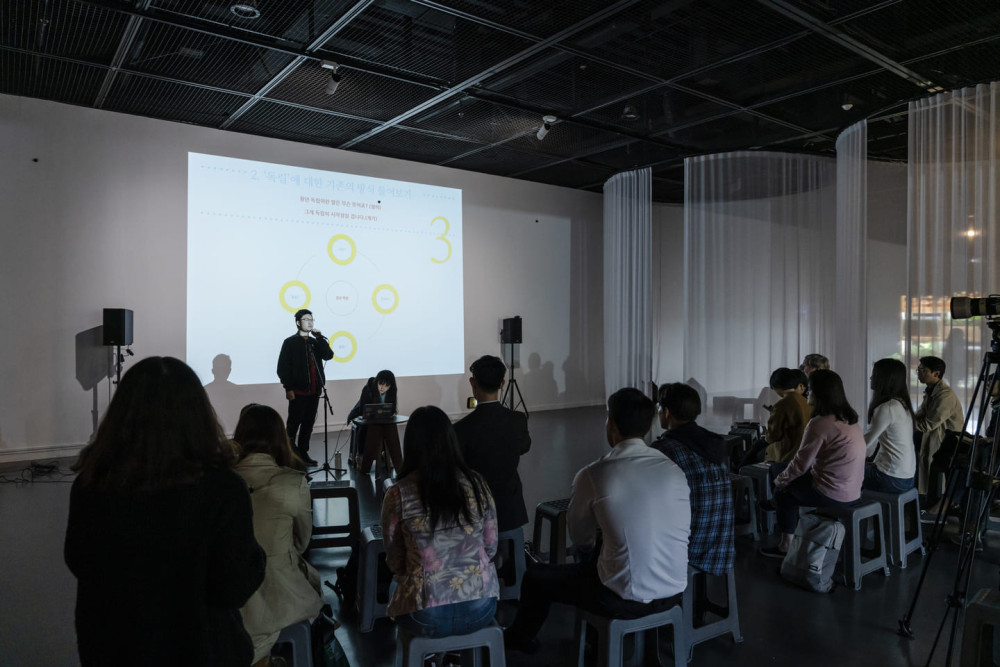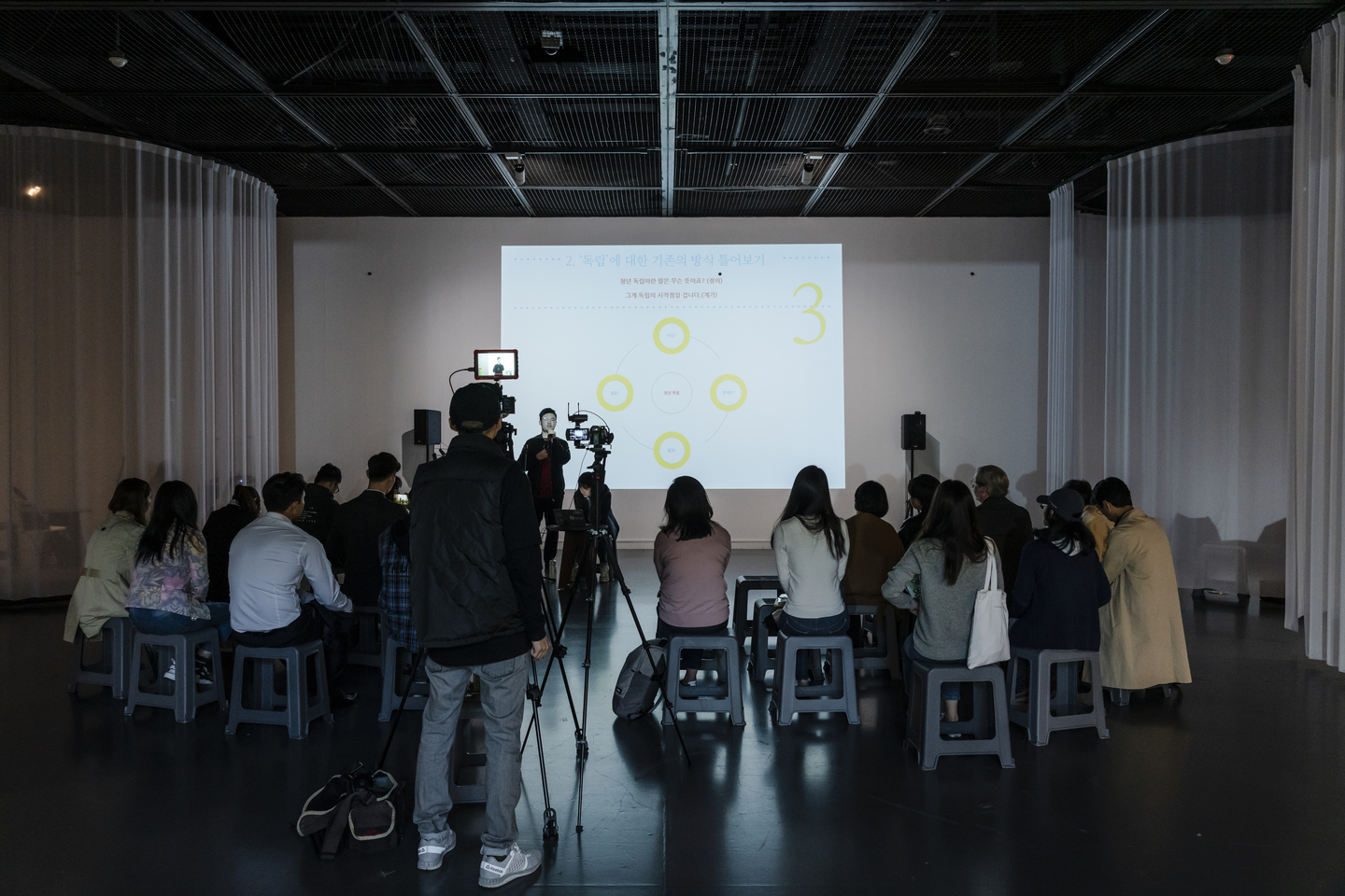 제10회 서울미디어시티비엔날레 《좋은 삶》 강연 ‘청년 독립의 재구성: ‘자치적’ 독립과 그를 위한 조건들’ 홍기빈 강연+프로젝트 소개. 강연자: 홍기빈. 작가: 복지국가청년네트워크·무중력지대 양천. 서울시립미술관. 2018. 10. 06. 사진: 스튜디오 수직수평(유용지+홍철기)