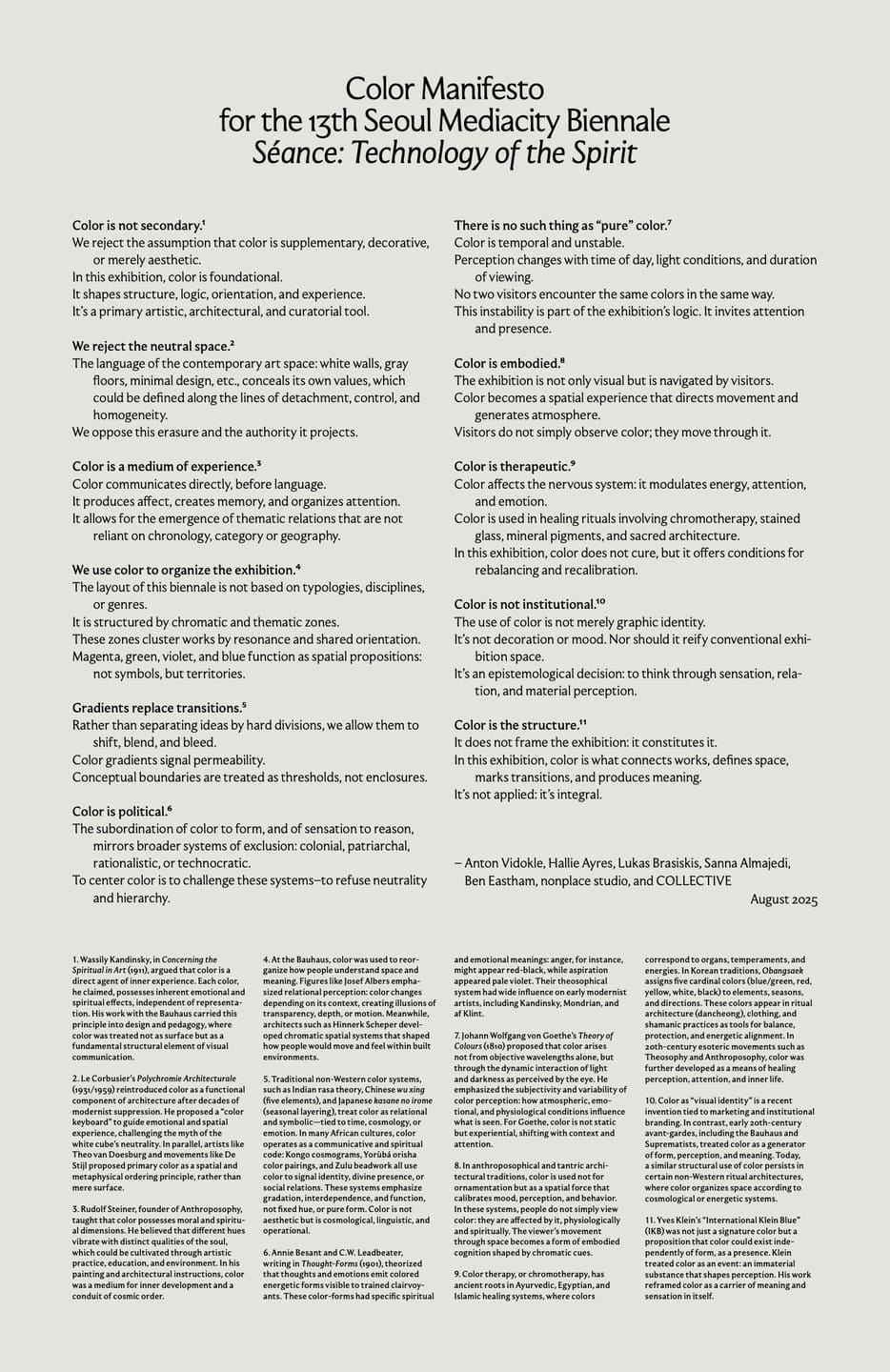 The Artistic Directors of the 13th Seoul Mediacity Biennale Séance: Technology of the Spirit, along with Sound Room and performance curator Sanna Almajedi, English editor Ben Eastham, graphic designers nonplace Studio, and exhibition space designers COLLECTIVE, have released a “Color Manifesto.” Color plays an important role in the 13th Seoul Mediacity Biennale, which is organized into a series of intersecting “chromatic zones.” To explain their thinking, the artistic team have published a “color manifesto” that outlines their approach to color as a structuring principle and “primary artistic, architectural, and curatorial tool.”