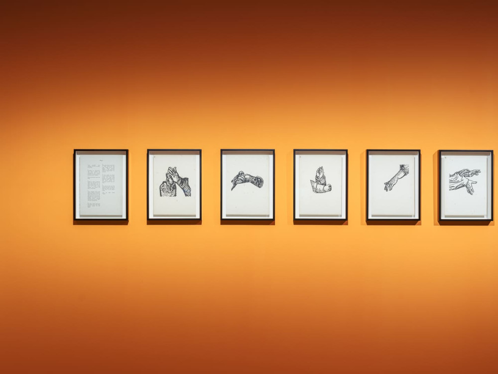 Inspired by Albrecht Dürer’s famous pen-and-ink drawing Praying Hands (1508), Magic Hands is a series of silkscreens reproducing images of the hands of saints drawn from other books printed by Dürer, paired with text from a book of magic tricks. Isolated from their original backgrounds, with the accoutrements of magical performance edited out, these hand gestures could be devotional actions or expressions of a secret language. Printed on antique and repurposed paper once used in the same museum in Vienna that houses Dürer’s masterpiece, these works also function as palimpsests of overlaid and obscured histories.