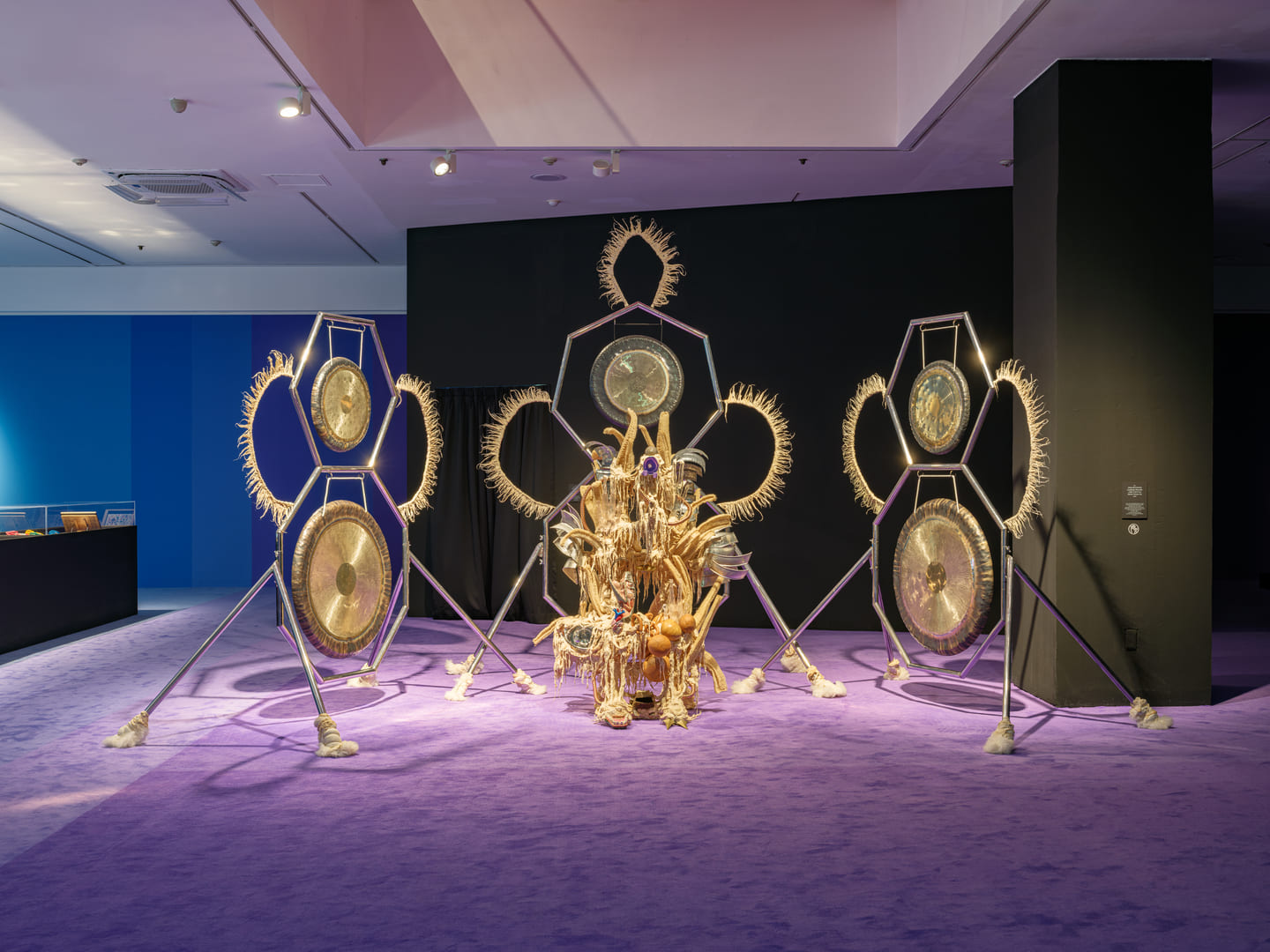 Comprising materials as varied as loofahs, an anatomical model of a snake’s head and heart, obsidian, and six gongs, Disease Thrower #17 is designed to be activated by the artist during ceremonial rituals. These works incorporate objects, selected for their animistic properties, that Maravilla collected while retracing his childhood migration.