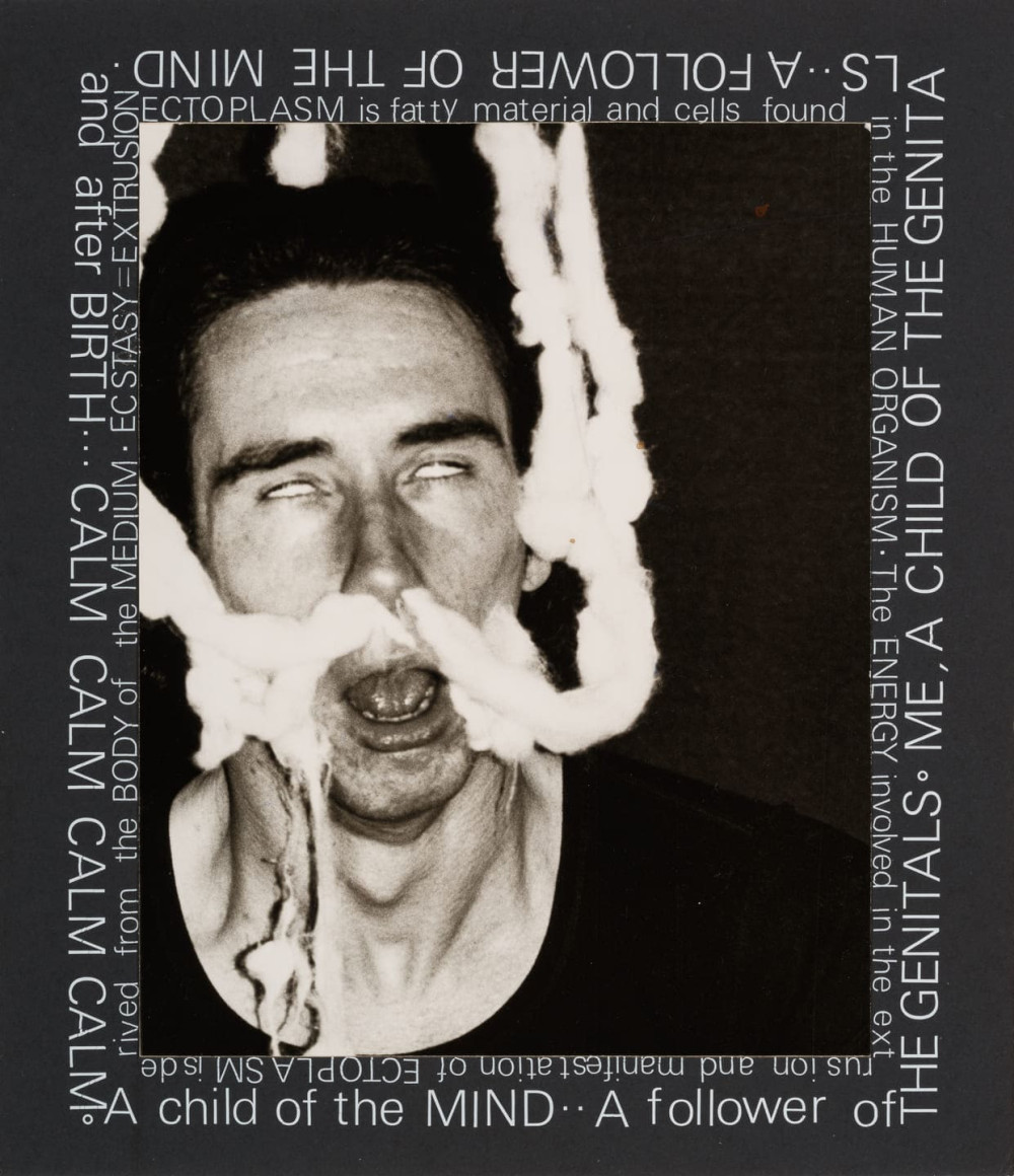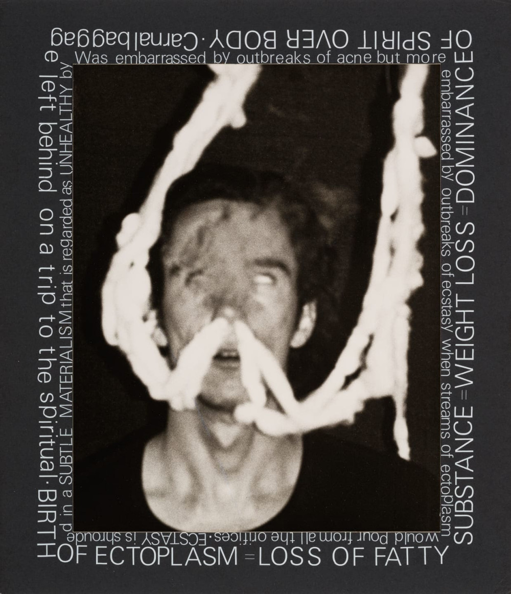 “The Poltergeist” series pays ambivalent homage to the history of spiritualist photography, which gained popularity at the end of the nineteenth century for its claim to capture images of the dead on film. In these staged self-portraits, the artist is caught in the act of making contact with the spirit realm. The luminous substance streaming from the artist’s nose, mouth, and ears is ectoplasm, a paranormal material that emanates from the body of a medium in the performance of a séance. Only a skeptical materialist could mistake it for cotton wool.