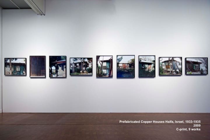 Prefabricated Copper Houses Haifa, Israel, 1933–1935 is a continuation of her earlier series featuring prefabricated buildings in Germany. Composed of nine photographs, this series documents the houses that were transported from Germany to Palestine with the emigration of German Jews and the export of German goods to Palestine facilitated by the 1933 Haavara Agreement. The agreement, which was signed by the German Zionist Organization and the Jewish Agency, was a scheme by which the Nazi government planned to resolve its financial difficulties and effectively control the country’s Jewish population. In this work, Kelm metaphorically addresses the political and economic ironies of this period through photographs of these prefabricated houses. The quality of analog photography, maximized by Kelm’s use of large-format camera, captures subtle details and lends her images the precise execution needed to convey the weight of the artist’s intention.