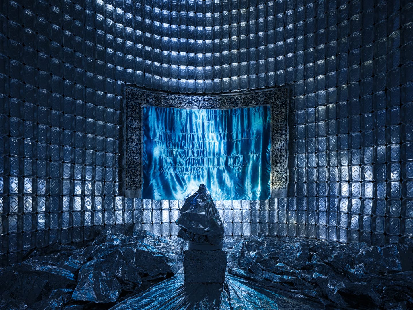 The New Genius Temple of the Great Atomic Bombreflector is a device created according to the principles of “New Genius Theory.” Its central element is the tus kiiz carpet—an portal between dimensions in traditional Kazakh culture—which is embroidered with the magical words of Kalmykov. Built of 5,000 disposable aluminum containers, the temple was designed specifically for the Crystal Gallery at Seoul Museum of Art, which ORTA treats as a “crystal that collects and focuses the flows of the museum’s artistic energy.” Inside it, visitors are able to connect their genius to “the Spectacular Channel” that transforms violence into creativity.