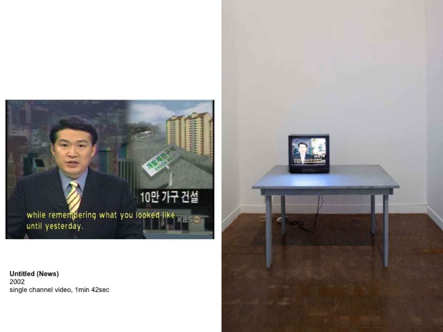 Untitled (News) is made up of recorded and re-edited cable television news programs. Working from the basic acknowledgement that television programs represent the fundamental synthesis of visual image and spoken language of our age, the artist breaks them down into syllables and fabricates four stories out of the actual accounts delivered by anchorpersons.