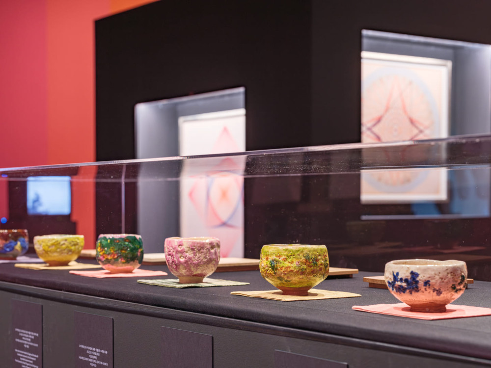 (5) Onisaburo Deguchi, Yōwan (Scintillating Bowls)—Tengoku 31 (the heavenly kingdom, the 31st), 1944. raku pottery tea bowls. 8.4 × 11.3 × 11.2 cm