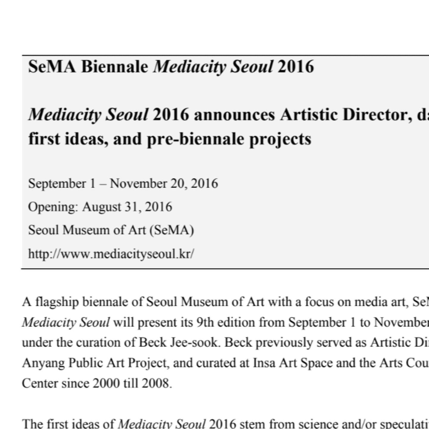 Press Material TitleMediacity Seoul 2016 announces Artistic Director and pre-Biennale projects