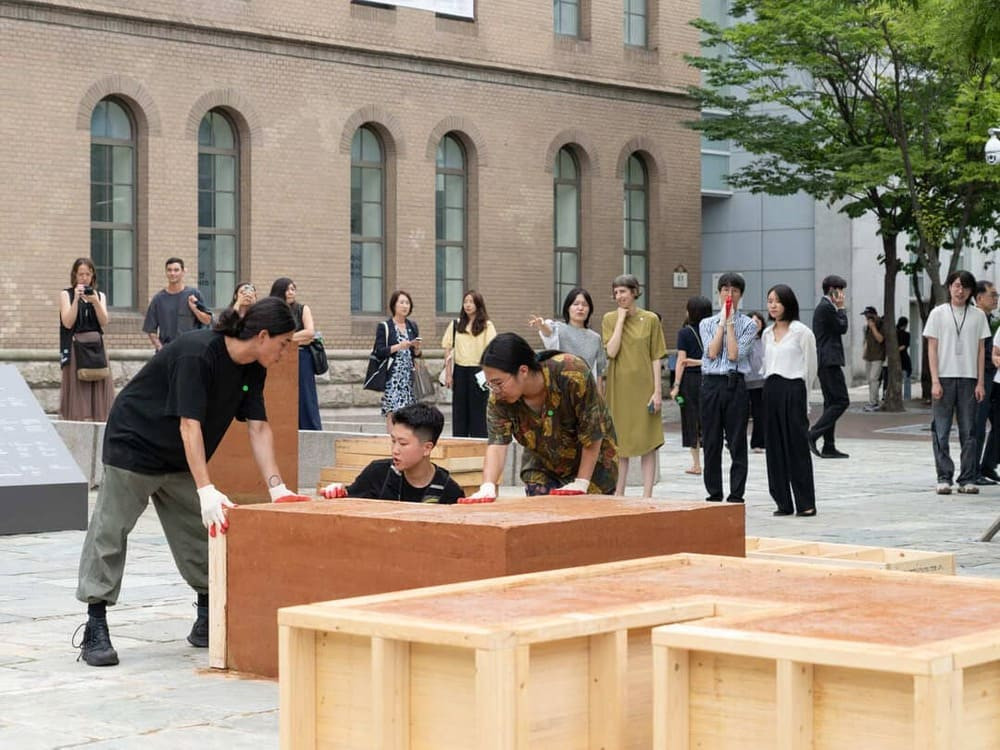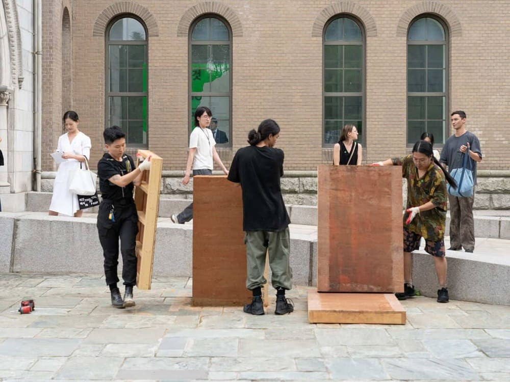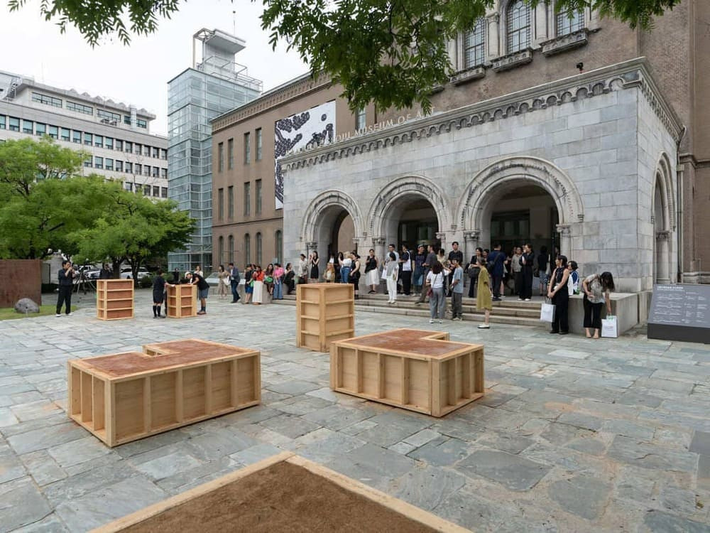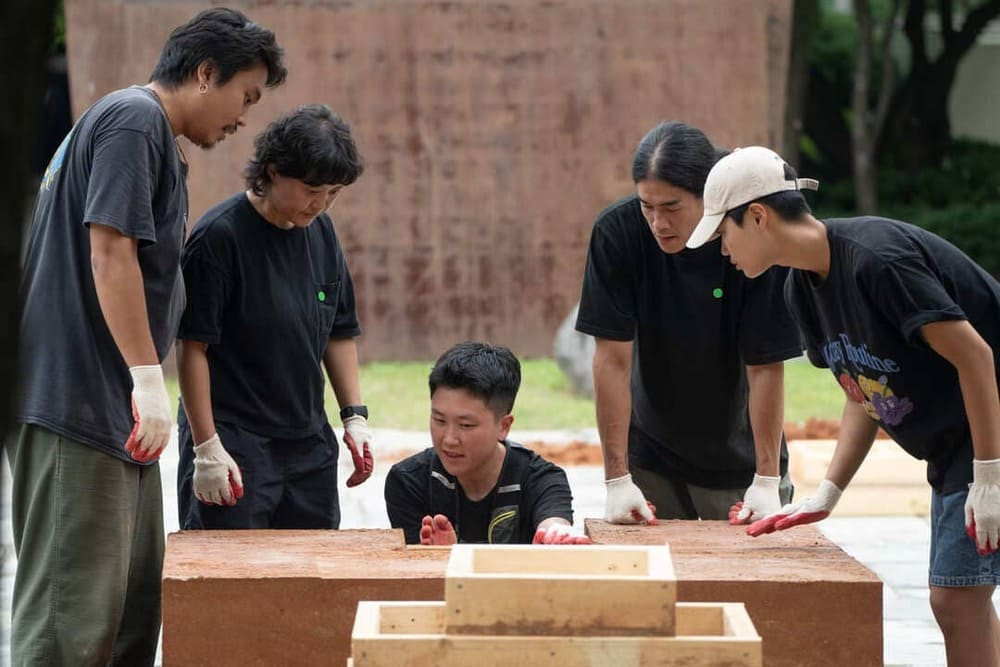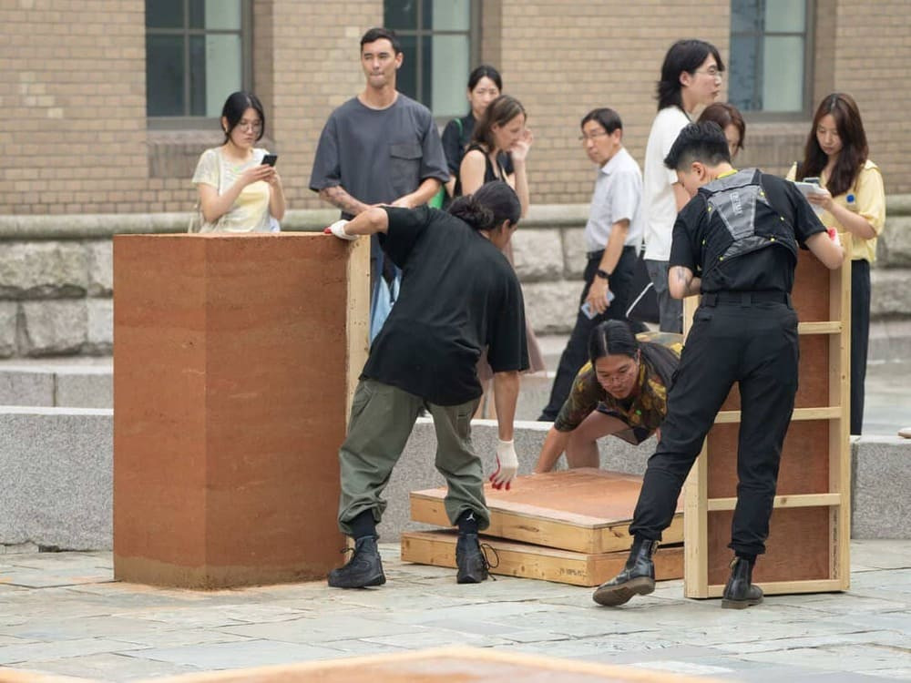A new iteration of Earth Monument commissioned for SMB12 brings together ikkibawiKrrr’s past and present investigations. Three groups of soil monoliths stand in the museum’s courtyard, evoking a small town or newly developed city, composed of a mixture of soil, debris, and trash collected from the outskirts of Seoul’s satellite cities. Formerly home to industrial complexes, these cities were also home to the migrant communities that used to work in the factories, which are now being replaced by apartment blocks. As redevelopment has led to the displacement of migrant workers and dissolution of their communities, large plots of trees—some of which are a hundred years old—have also been uprooted, cut down, or displaced. The transfer of soil that used to connect communities and trees alike to the city center speaks to the movement of human and nonhuman individuals and communities across the country, as well as corresponding realities of migration and the bureaucratic boundaries of life.