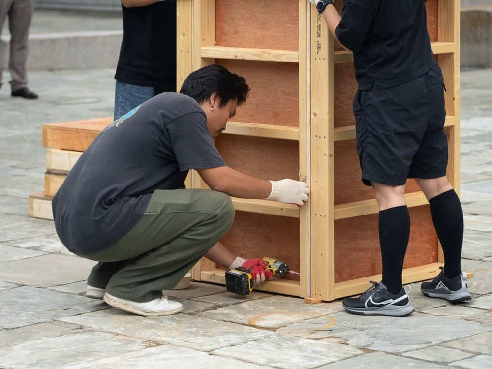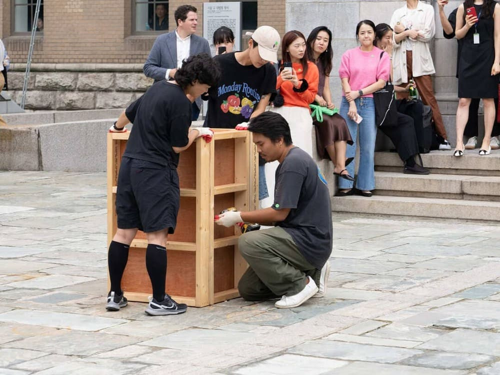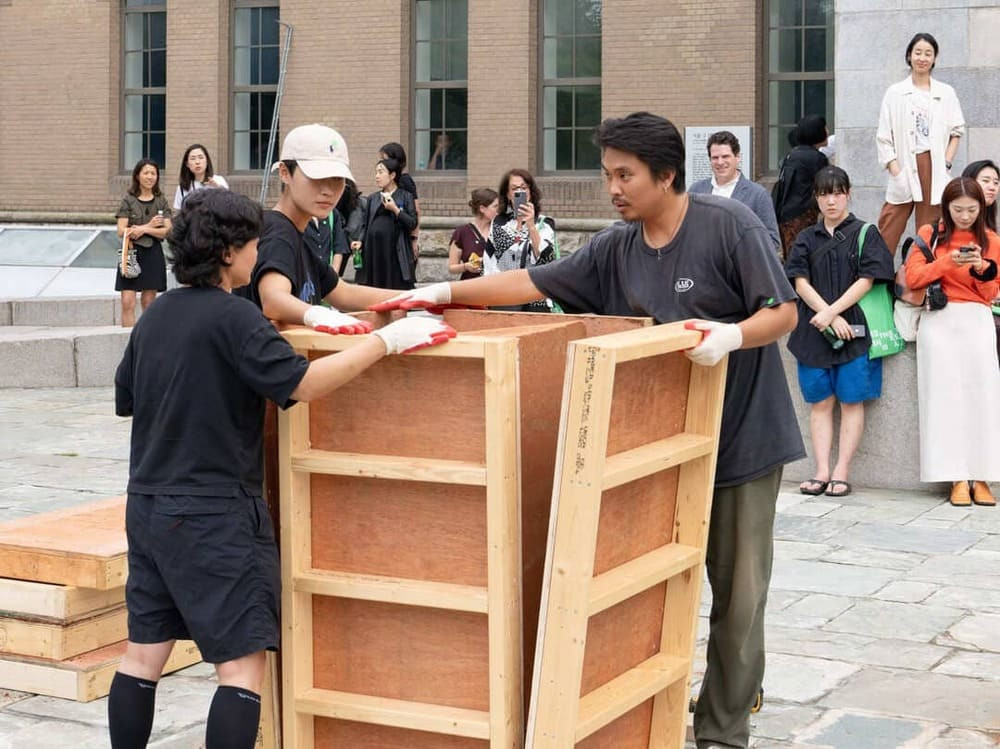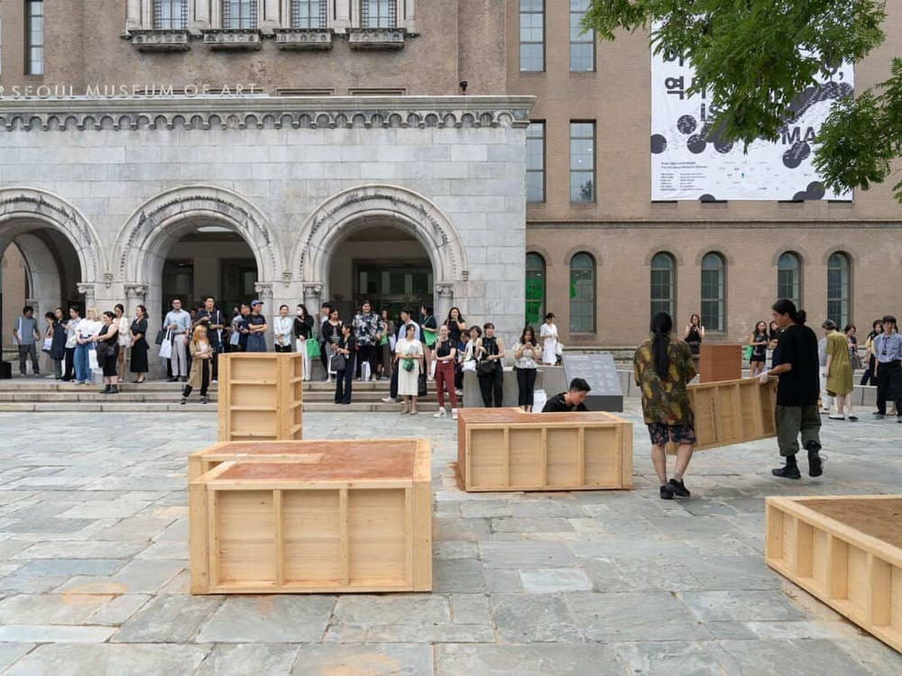 A new iteration of Earth Monument commissioned for SMB12 brings together ikkibawiKrrr’s past and present investigations. Three groups of soil monoliths stand in the museum’s courtyard, evoking a small town or newly developed city, composed of a mixture of soil, debris, and trash collected from the outskirts of Seoul’s satellite cities. Formerly home to industrial complexes, these cities were also home to the migrant communities that used to work in the factories, which are now being replaced by apartment blocks. As redevelopment has led to the displacement of migrant workers and dissolution of their communities, large plots of trees—some of which are a hundred years old—have also been uprooted, cut down, or displaced. The transfer of soil that used to connect communities and trees alike to the city center speaks to the movement of human and nonhuman individuals and communities across the country, as well as corresponding realities of migration and the bureaucratic boundaries of life.