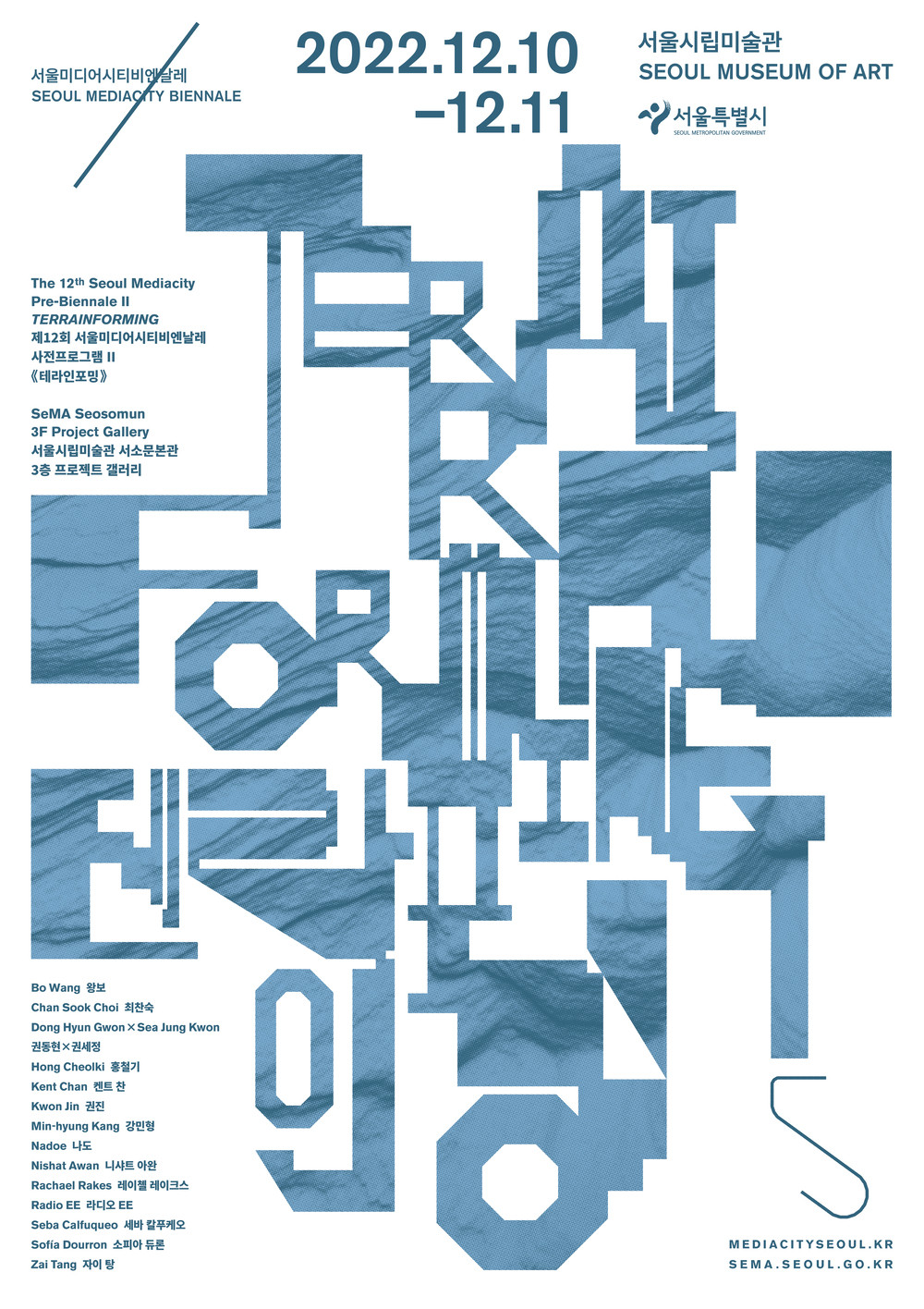 The 12th Seoul Mediacity pre-Biennale II TERRAINFORMING Poster. Seoul Museum of Art. 2022. 12. 10 - 12. 11. Design: Mabasa (An Mano, Kim Jeeseop)