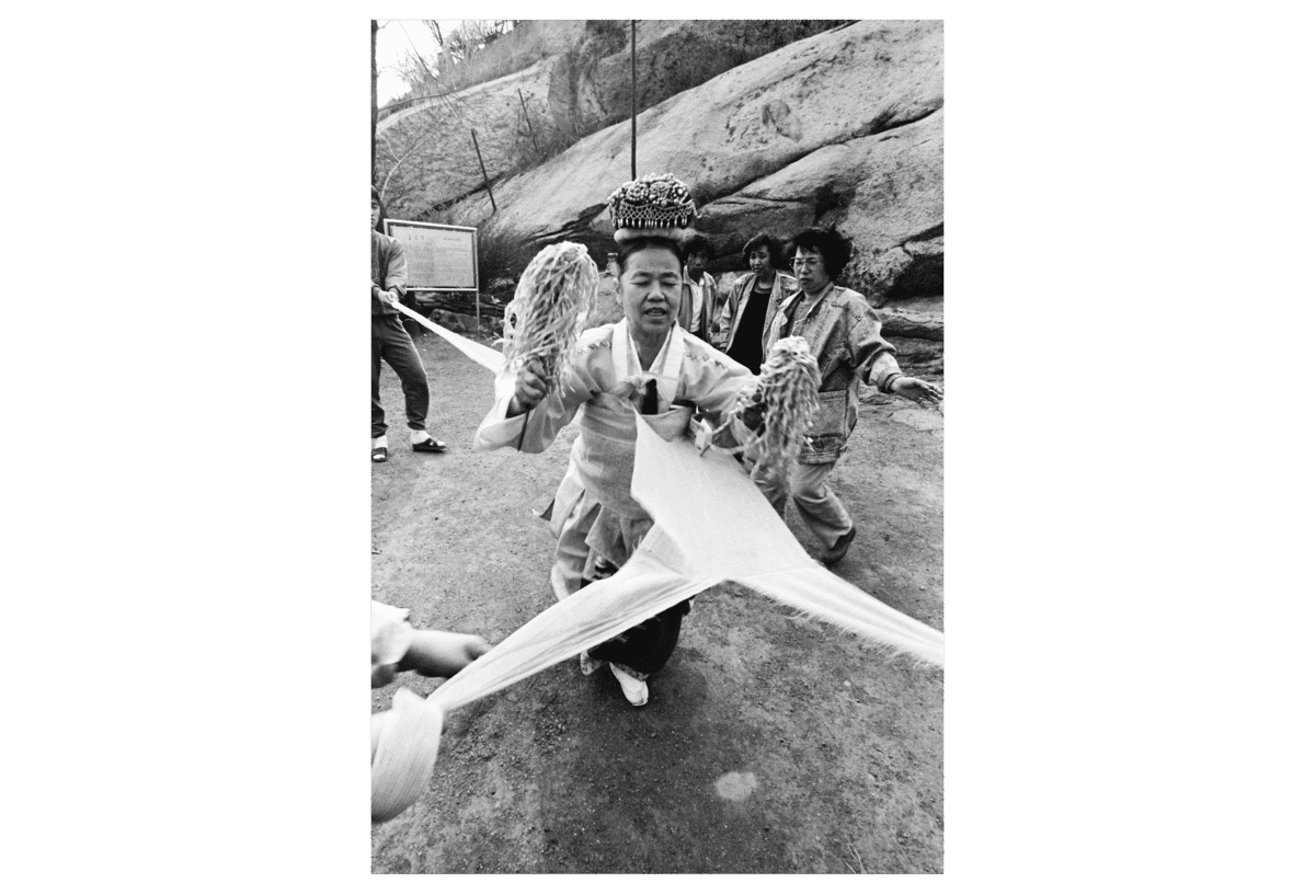 저녁 어스름, 아침에 시작한 진오기굿이 막바지에 달해 마침내 망자가 가족들과 이별할 시간이 되었다. 굿당 앞마당에는 망자가 저승 가는 길에 반드시 거쳐야 할 열두 대문이 세워져 있다. 하루 종일 굿판에서 죽은 사람을 만나 울고 또 울었던 가족은 이제 지쳤는지 기운 없이 마루에 앉아있다. 그 가족들 앞에 화려한 복색의 무녀가 장고를 앞에 놓고 의자에 앉는다. 목이 휘청하게 무거운 큰 머리 얹고 칠보 장식한 은비녀에 찰랑이는 뒤꽂이로 온갖 호사를 한 무녀. 옷차림도 예사롭지 않다. 나뭇가지를 얼기설기 엮어 정사각형으로 만든 전통 페치코트 갈매막대기 위에 속치마만 열두 개를 껴입었다. 그 위에는 붉은색 비단치마를 떨쳐입고 당의를 걸쳤다. 옛날 공주 복색이다. 품위 있게 댕기를 늘어뜨리고 부채, 방울을 옆에 놓은 무녀가 굿을 시작한다. 가족들은 피곤한 몸을 추스르고 무당 앞에 무릎을 꿇고 앉아 귀 기울여 듣는다.