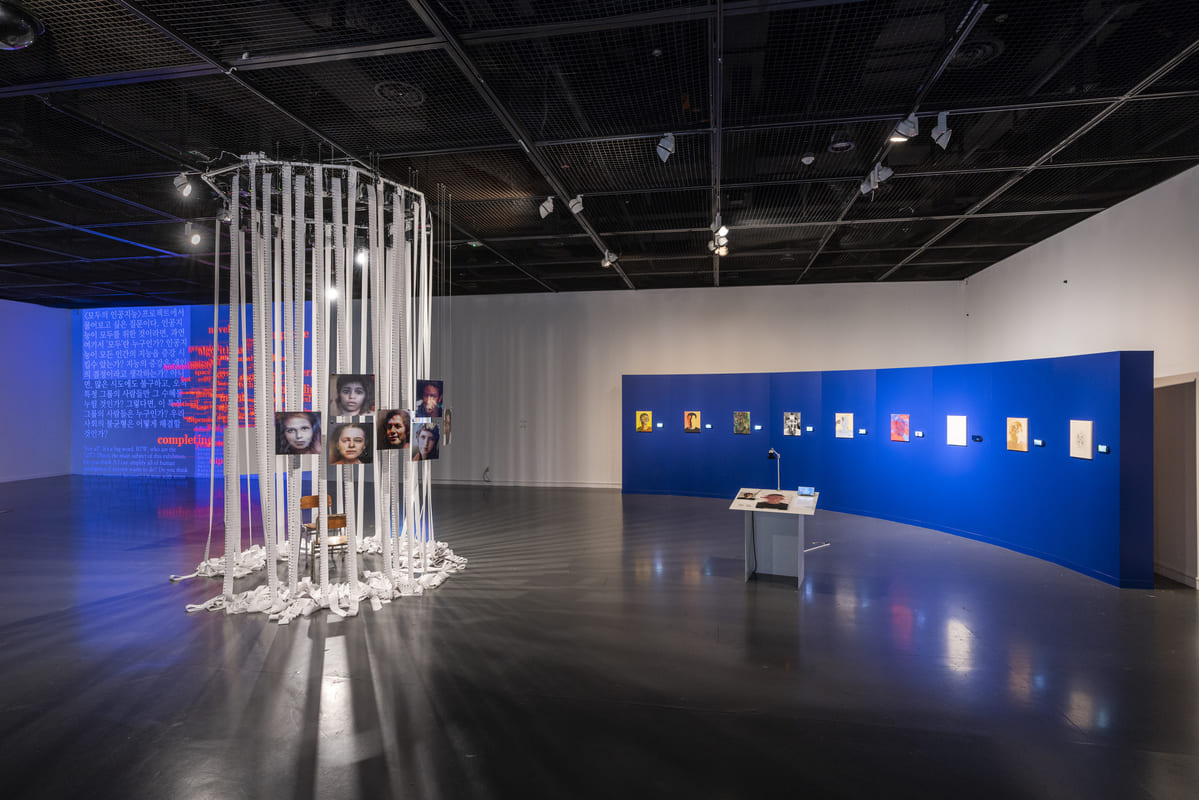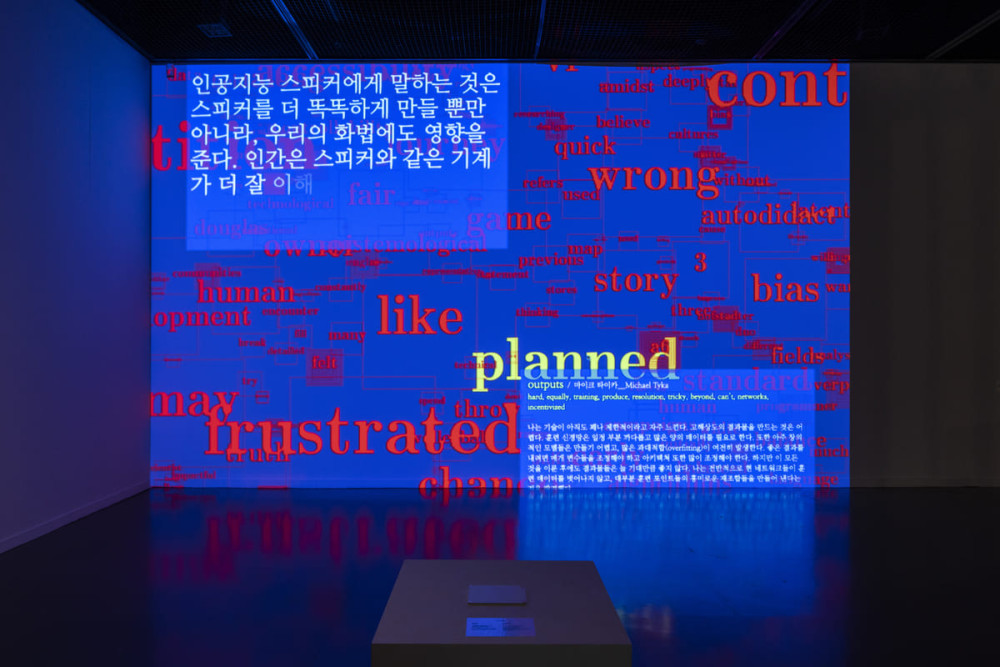 〈모두의 인공지능, A.I, entirely on us〉는 인공지능의 생활적 편리함에 익숙해지기 전에, 보다 근본적인 질문을 우리 스스로에게 한다. 인공지능(A.I)이 인공(Artificial)이 아닌 증강된(Augmented) 지능을 의미한다고 한다면, 과연 누구의 지능이 증강되고 있는 것인가. 어쩌면 특정한 사람들만이 향유할 수 있는 기술이 되고 있는 것은 아닌가. 여기서 말하는 ‘모두’의 범위에 나는 속하는가. 나의 지능은 인공지능과 함께 증강될 수 있는 것인가. 여기서 말하는 ‘모두’는 누구인가. 이 전시에 초대된 사람들은 그 ‘모두’에 속하는 사람들인가. ‘모두’는 도달할 수 없는 이상적 지점이며 그 누구도 만족시킬 수 없는 불완전한 조건이다. 인공지능은 과연 ‘모두의’ 가 될 수 있는가.