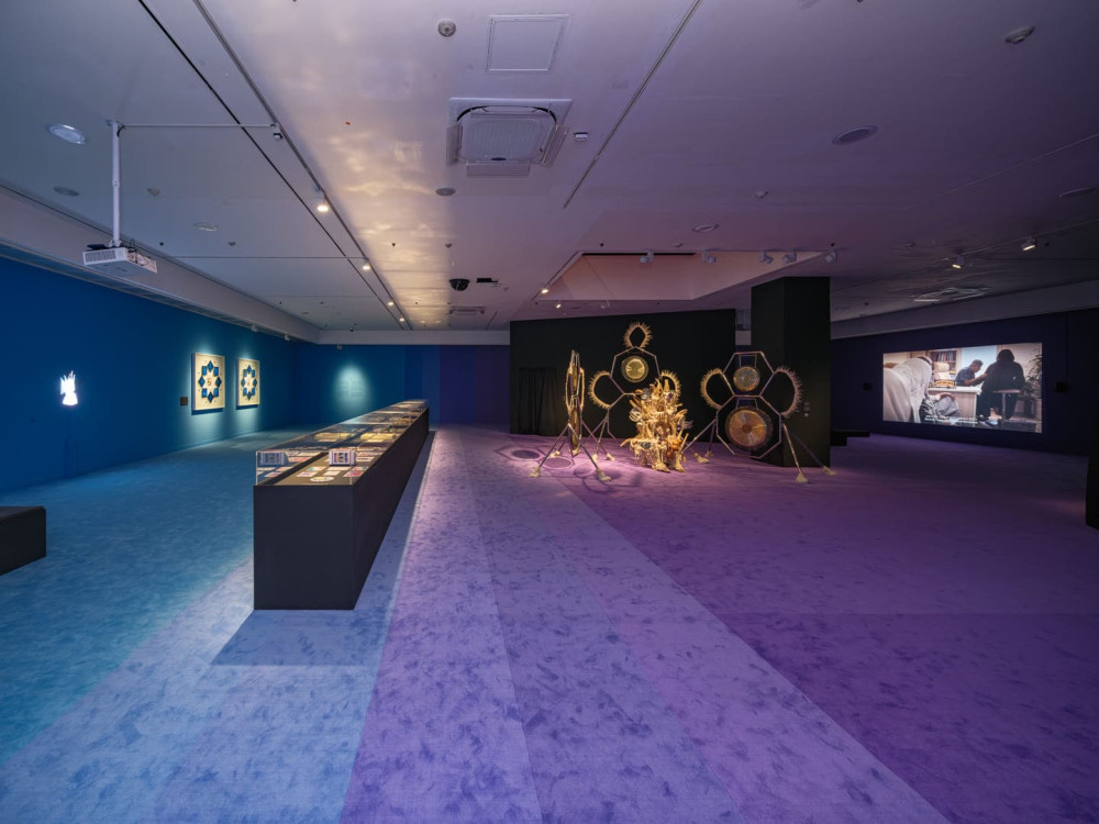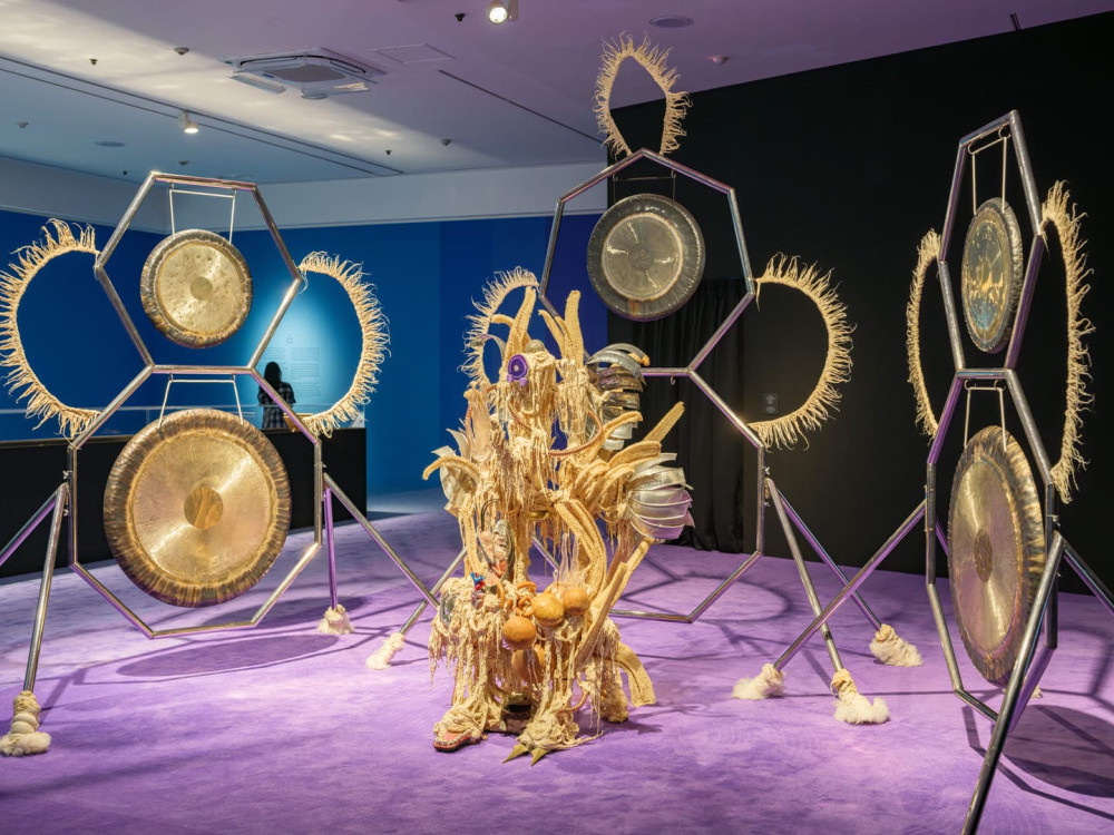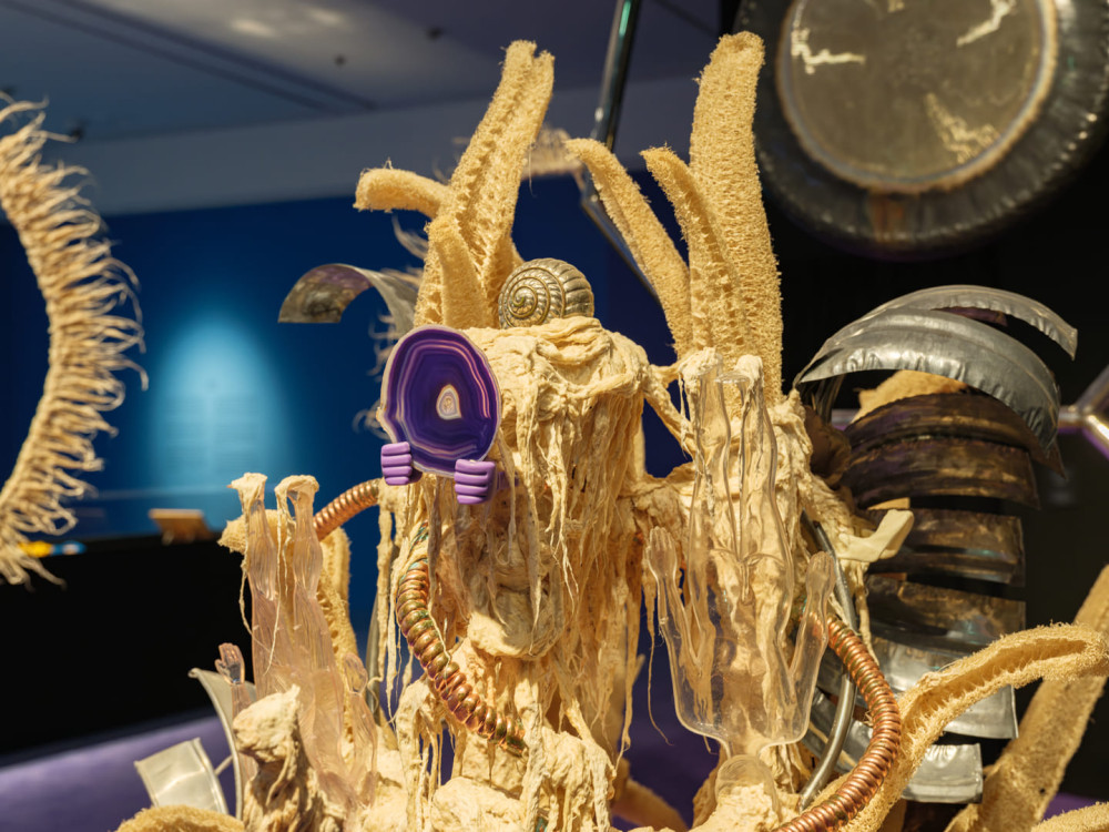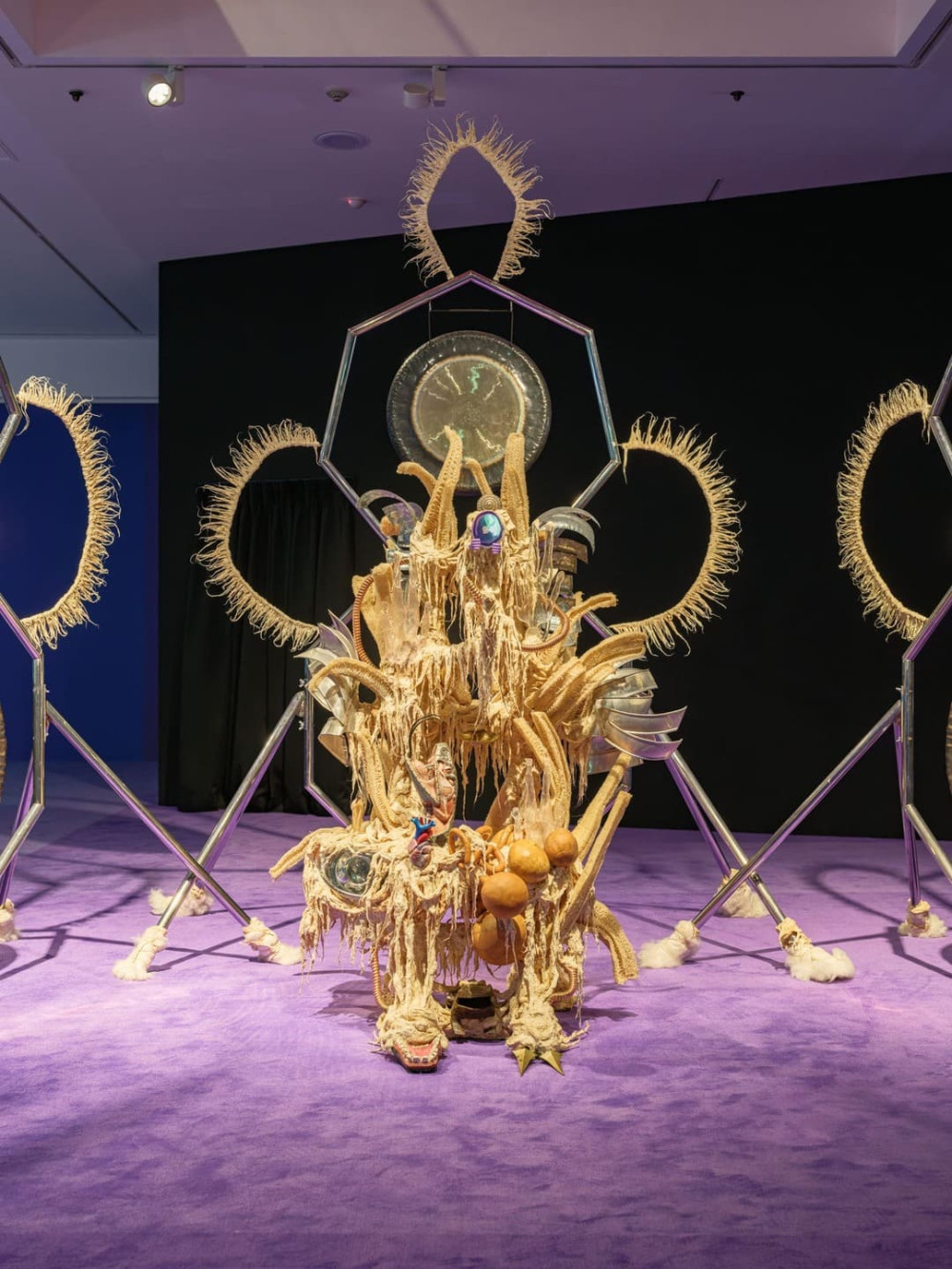 과달루페 마라비야, 〈질병 투척기 #17〉, 2021. 징, 철, 나무, 면, 접착제 혼합물, 플라스틱, 수세미, 그리고 작가의 이주 경로를 되짚어보는 의식에서 수집된 물건들. 251 × 244 × 140 cm. 작가 및 P·P·O·W 갤러리, 뉴욕 제공. 제13회 서울미디어시티비엔날레 《강령: 영혼의 기술》. 서울시립미술관, 2025. 사진: 홍철기