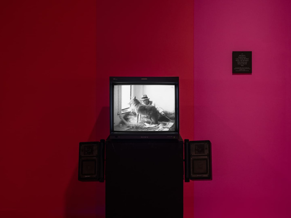 〈나는 미국을 좋아하고 미국은 나를 좋아한다〉는 1974년 뉴욕에서 있었던 상징적인 퍼포먼스를 기록한 영상입니다. 공항에 도착해서 곧바로 구급차를 타고 르네 블록 갤러리로 이동한 보이스는 갤러리 안에서 코요테와 함께 3일을 보낸 후, 다시 같은 구급차를 타고 공항으로 돌아갑니다(따라서 미국 땅을 전혀 밟지 않은 것이 됩니다). 길들여지지 않은 자연과 식민지 이전 시대 미국을 상징하는 영적 존재인 코요테와 함께 특정 기간을 지내는 퍼포먼스에서 보이스는 우리 행성을 공유하는 다른 종들과 다시 연결되는 방법으로서 의례를 제안했습니다.