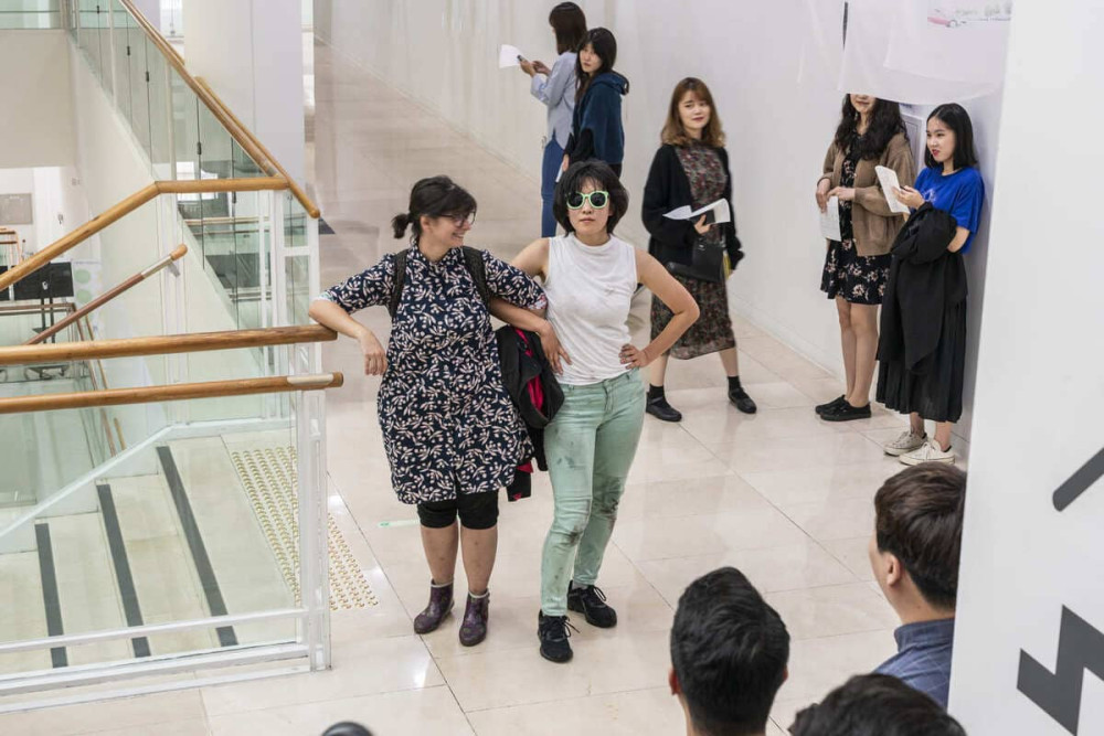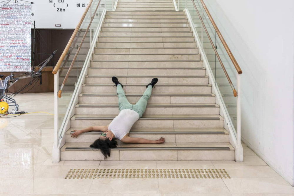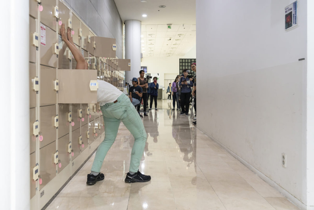 〈은근어디든〉은 관객들이 이동하면서 관람하는 공연과 공연에 대한 텍스트 형태의 단서들로 이루어진 작품이다. 텍스트들은 미술관 주변의 자연과 도시로부터 수집된 풍경과 순간들을 포착한, 그러나 어떤 것을 묘사하는지는 숨겨져 있는 문장들로서, 이를 바탕으로 퍼포머의 움직임이 안무된다. 본래 텍스트에 지시된 내용을 재현하는 것이 아닌, 문장에 담긴 스코어가 미술관이라는 공간의 맥락에서도 새롭게 성립될 수 있도록 움직임의 공간과 동작을 선택하는 것이다. 텍스트가 쓰여진 유인물은 퍼포먼스의 흔적으로서 전시 기간 동안 미술관 내부, 곳곳의 경로들에 남겨진다. 구체적이고 물리적인 공간으로서의 미술관과 틈입하는 퍼포머의 몸, 퍼포머를 따라 이동하며 그에게 시선을 주고 감각을 여는 관람자의 몸이 긴밀한 관계를 맺으며 하나의 유기적인/비유기적인 현상을 만들어낸다.