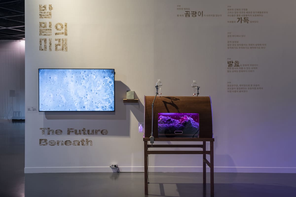 〈발 밑의 미래〉 프로젝트는 크게 연구, 전시, 프로그램으로 구성된다. 첫 번째는 ‘발효’의 작동체인 균과 인간을 구성하는 유기생명체 관찰기로서의 연구 및 전시이다. 두 번째는 관람객들과 함께 현장에서 배양한 버섯이나 효모와 같은 균을 관찰하고 먹어봄으로써 경계를 붕괴시키는 행위를 실행하는 퍼포먼스 프로그램을 진행한다. 그리고 마지막으로 ‘아트 & 에콜로지’ 프로젝트를 지속해온 옌니 누르멘니에미 큐레이터와 뚜오마스 알렉산더 라이띠넨이 조직한 마이리아곤(Myriagon)을 초청하여 ‘다양한 종의 좋은 삶’에 대해 살펴보는 렉처 퍼포먼스 「마이리아곤 1: 낱말의 여러 세계」를 통해, 인간을 포함한 주변 환경 속 다양한 유무기체의 다층적인 삶에 대해 질문하고 복잡하게 얽혀 공존하는 삶의 방식을 탐구한다.