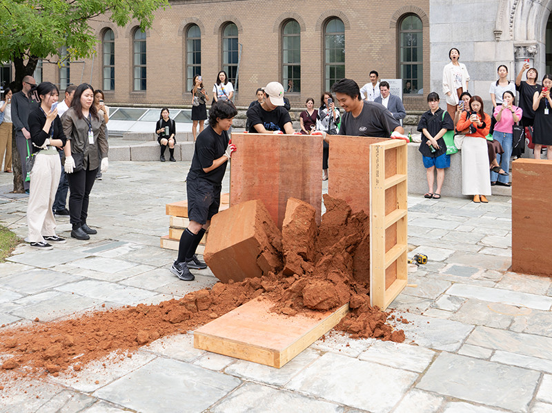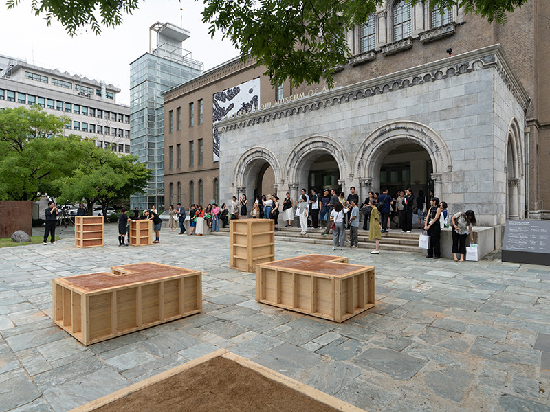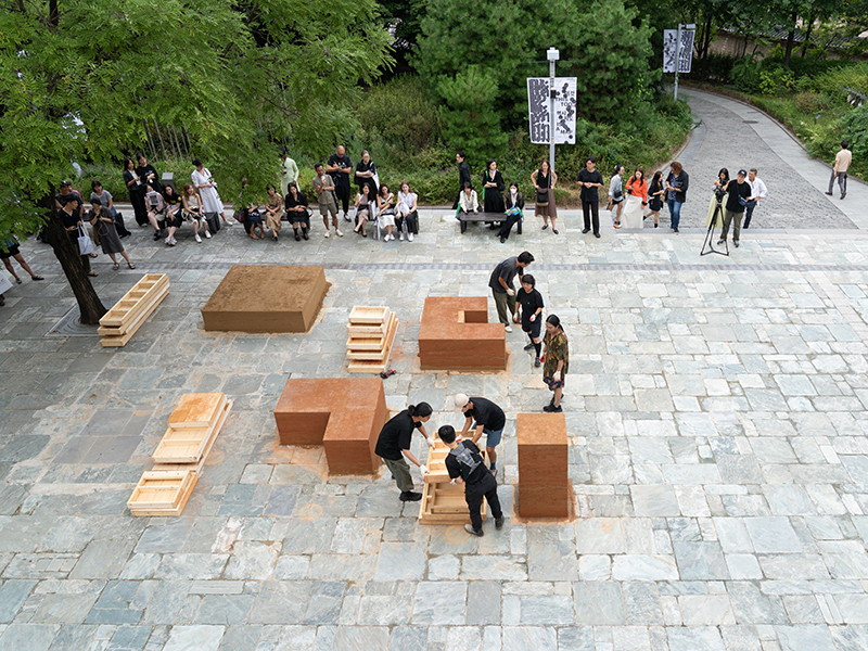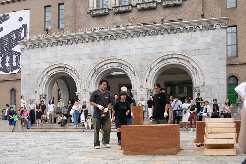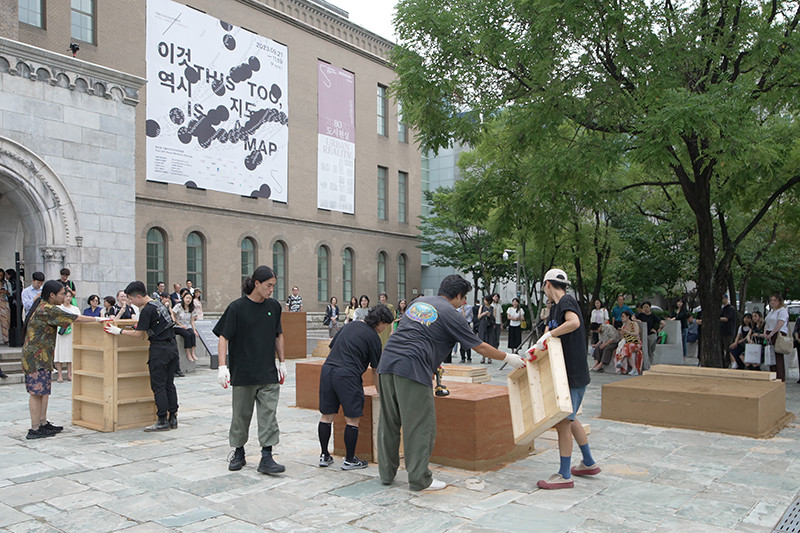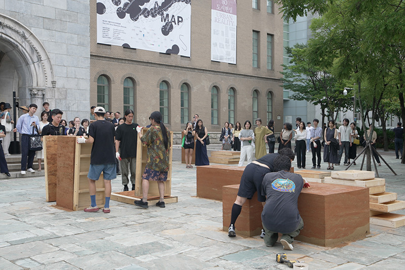 이끼바위쿠르르는 〈땅탑〉을 통해 공동체와 나무를 이어주던 흙을 도심이라는 낯선 환경으로 옮겨옴으로써, 인간과 비인간, 공동체의 이동을 함께 조망한다. 이 작품은 전국 곳곳에서 벌어지는 이주와 정착, 그 과정에서 마주하는 삶의 경계와 행정적 시스템에 대한 서사를 담고 있다.