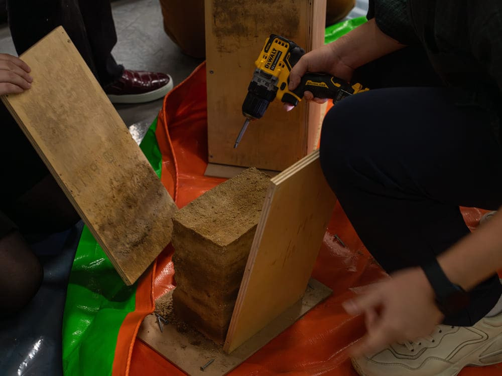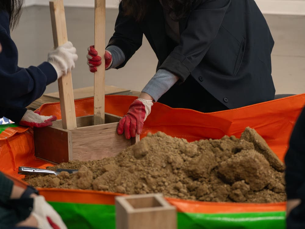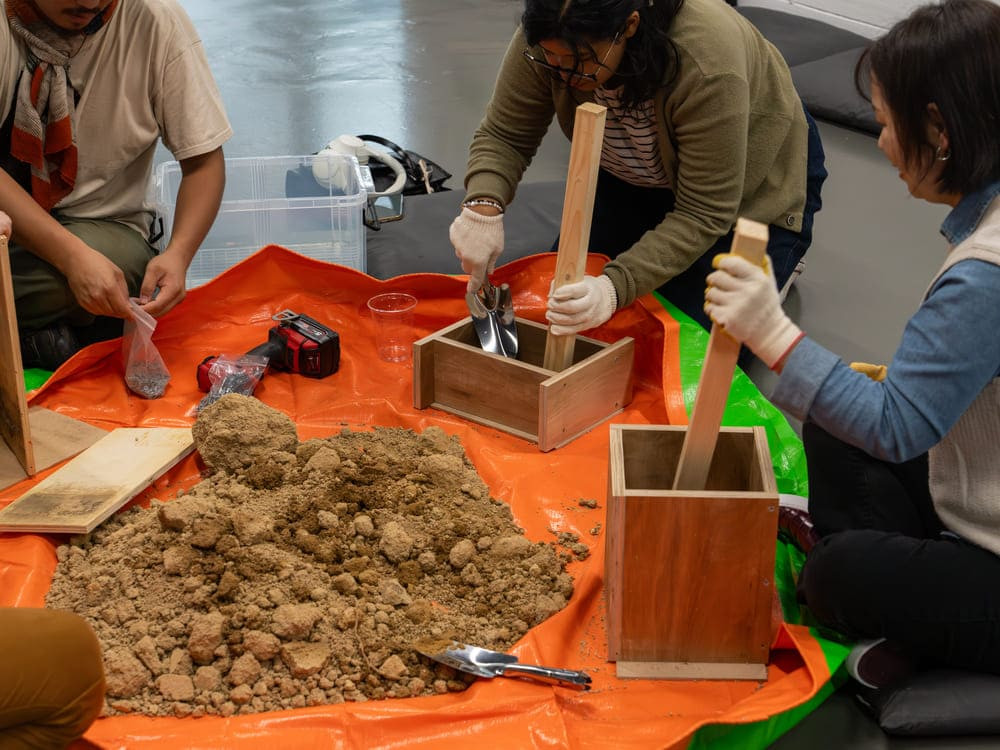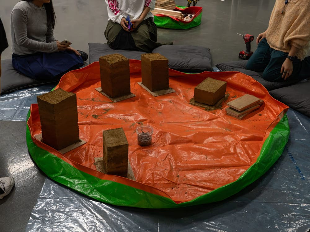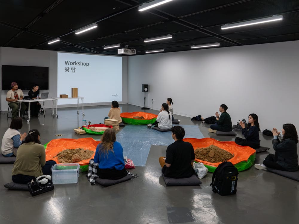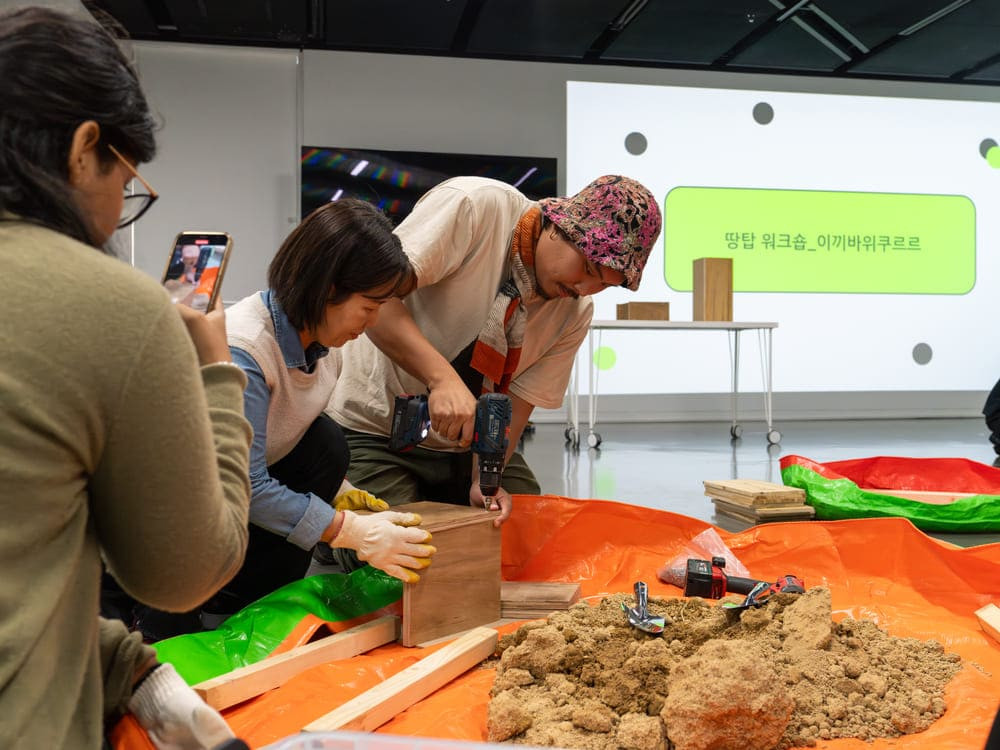 작가 이끼바위쿠르르가 진행하는 「땅탑 워크숍」은 이번 비엔날레에서 소개한 신작 〈땅탑〉의 제작 과정과 유사한 방식으로 작은 크기의 〈땅탑〉을 만들어보는 프로그램이다. 워크숍 참여자들은 작가와 함께 작은 나무 거푸집을 만들고, 그 안에 흙을 채우고 다져서 직사각형 모양의 조형물을 제작한다. 이렇게 완성된 조형물들은 하나의 좌대 위에 전시되며, 워크숍 진행됨에 따라 점차 쌓여가는 기념비가 형성한 흙 도시는 과거 산업 단지였던 곳에 들어선 신도시의 풍경을 연상시킨다.