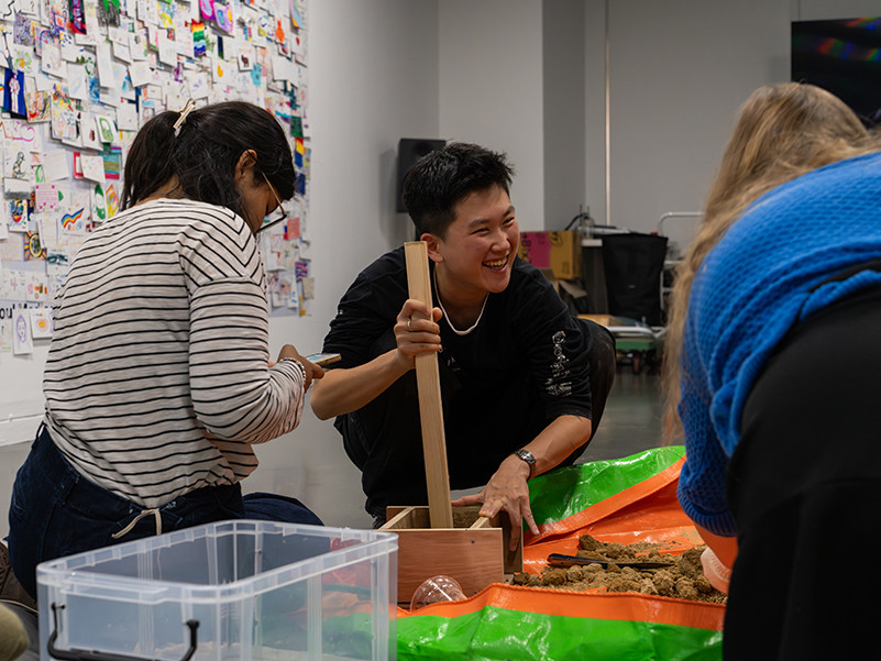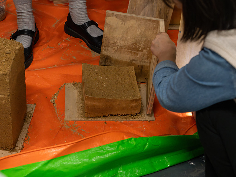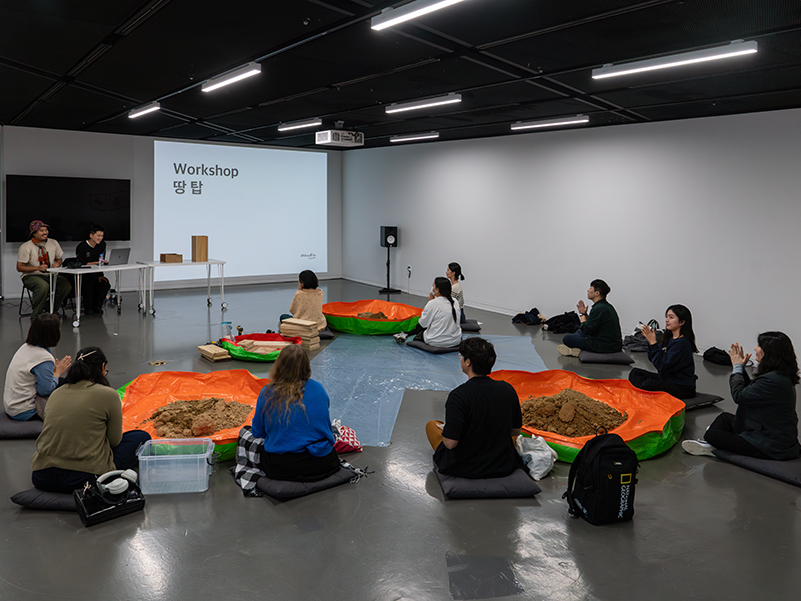 이번 비엔날레에서 소개한 신작 〈땅탑〉과 연계하여, 작품의 제작 과정과 유사한 방식으로 작은 크기의 〈땅탑〉을 만들어보는 워크숍이다. 작품은 서울 근교의 흙을 모아 거푸집에 담아 만든 무명의 기념비 형태다. 〈땅탑 워크숍〉에서 작가들은 워크숍에서 참여자들과 함께 작은 나무 거푸집을 만들고, 여기에 흙을 담아, 흙다짐 하여 직사각형 모양의 흙 조형물을 제작한다. 완성된 조형물은 프로젝트 갤러리 테이블에 전시되며, 함께 모인 조형물은 산업 단지에 갑자기 들어서는 신도시를 연상시키는 가상의 흙 도시를 형성한다. 도시 근교의 산업 단지는 공장에서 일하는 이주 노동자들의 보금자리이며, 갑작스러운 개발은 이들 공동체를 해체 시키고 이동하게 했. 수백 년 넘은 나무 역시도 개발이 시작되면 뿌리째 뽑혀 다른 곳으로 이주하게 된다. 공동체와 나무를 이어주던 흙의 이동은 전국적으로 행해지는 인간과 비인간의 이동에 관해 말을 건다.